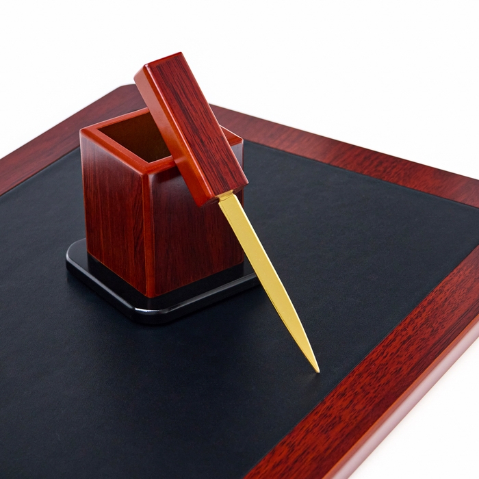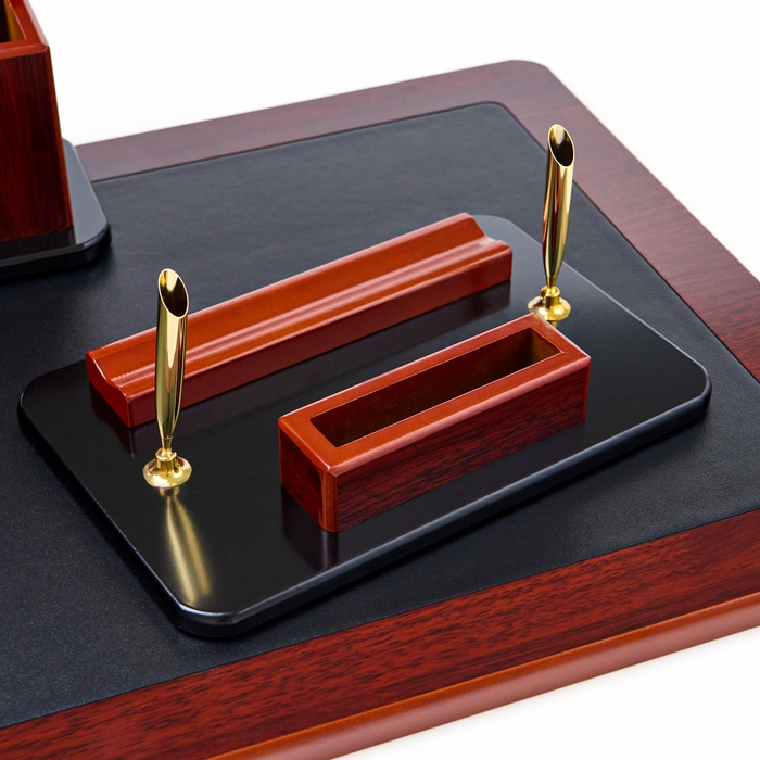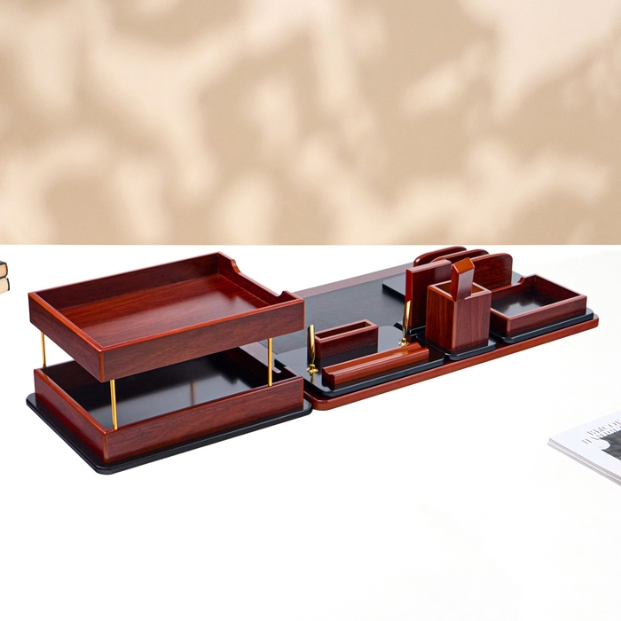 Компактный настольный набор поможет избежать хаоса на рабочем месте. Храните в нём канцелярские принадлежности или другие мелочи, чтобы правильно организовать пространство. К тому же изделие имеет минималистичный дизайн и выполнено под дерево, поэтому оно украсит собой любое место как декоративный элемент.
