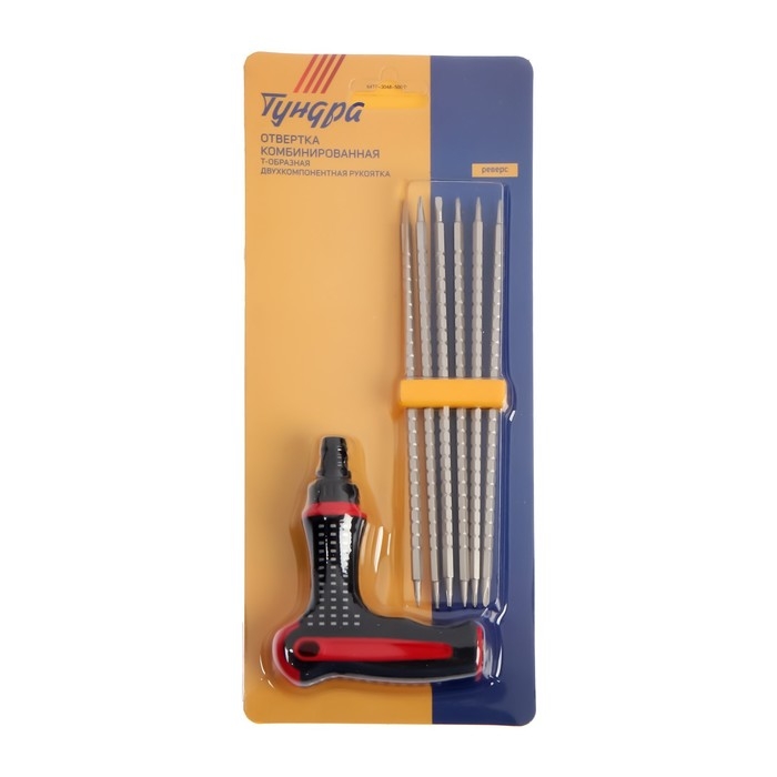 Отвертка комбинированная ТУНДРА, Т-образная 2К рукоятка, реверс, двухсторонние биты 6 шт.