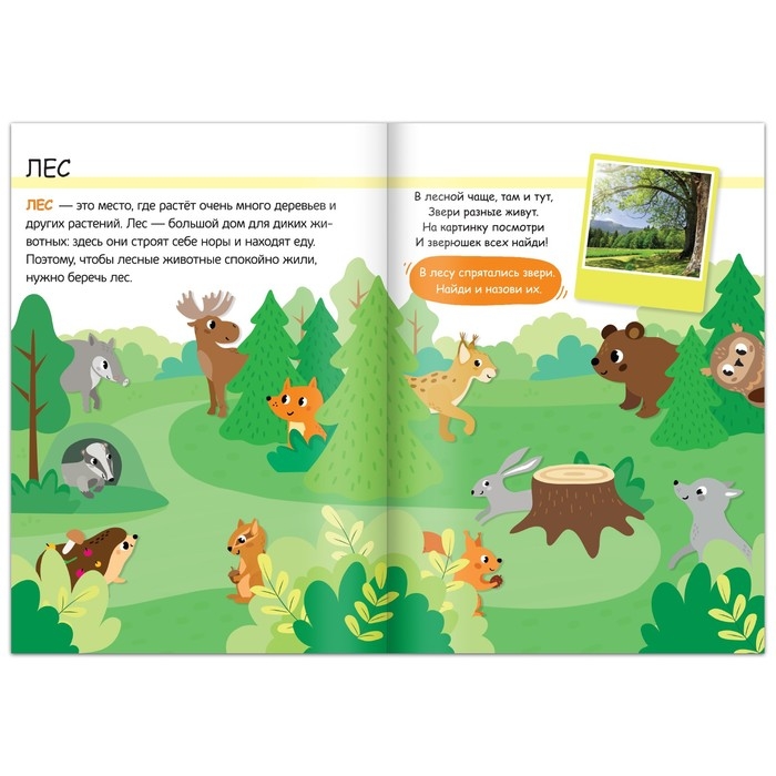 - Книга познакомит ребёнка с обитателями леса. Под обложкой вас ждут красочные фотографии и увлекательные рассказы о животных. А ещё в книге есть интересные задания и наклейки для их выполнения.