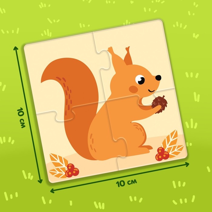 - Внутри коробки вы найдёте 12 пазлов, книжку с наклейками и раскраску про лесных животных.