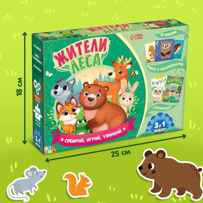 Набор 3 в 1 «Жители леса»: 12 пазлов, книга с наклейками, раскраска