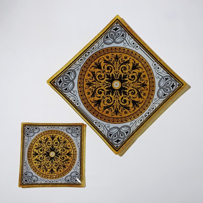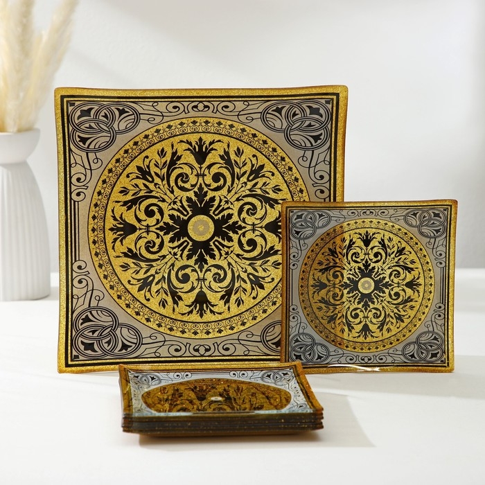 Набор столовый состоит из семи предметов: блюда 30×30 см и шести тарелок 18×18 см. Все предметы изготовлены из качественного стекла и имеют орнамент в восточном стиле. Тарелки прекрасно подойдут для сервировки праздничного стола, для семейного ужина или обеда.