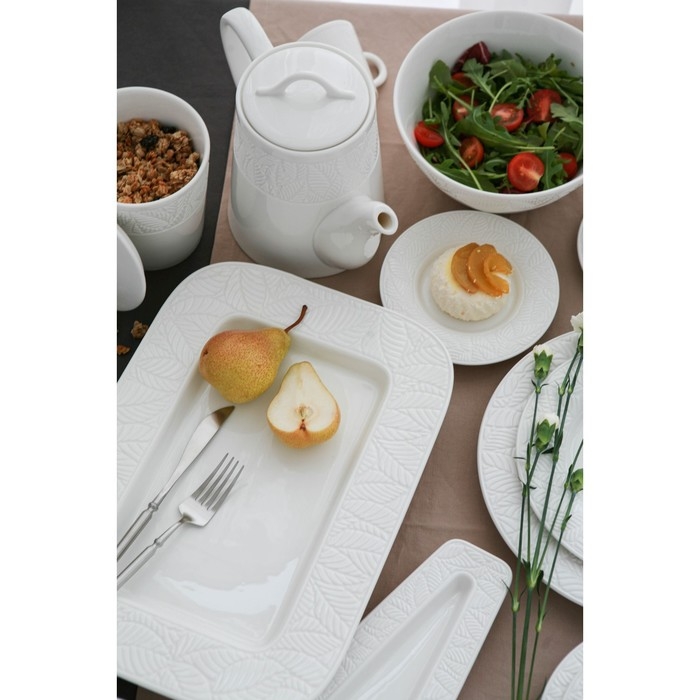 Посуда Magistro серии Сrotone – это безупречно изящная коллекция посуды из белоснежного фарфора, достойная украсить даже королевский стол. Традиционная форма изделий остается всегда актуальной и выглядит благородно. Рельефный узор в виде листьев выглядит особенно утончённо и придает посуде индивидуальности. Посуда Magistro Сrotone идеально впишется в любой современный интерьер!