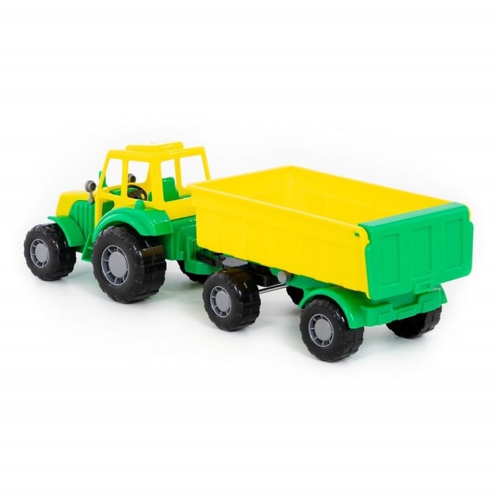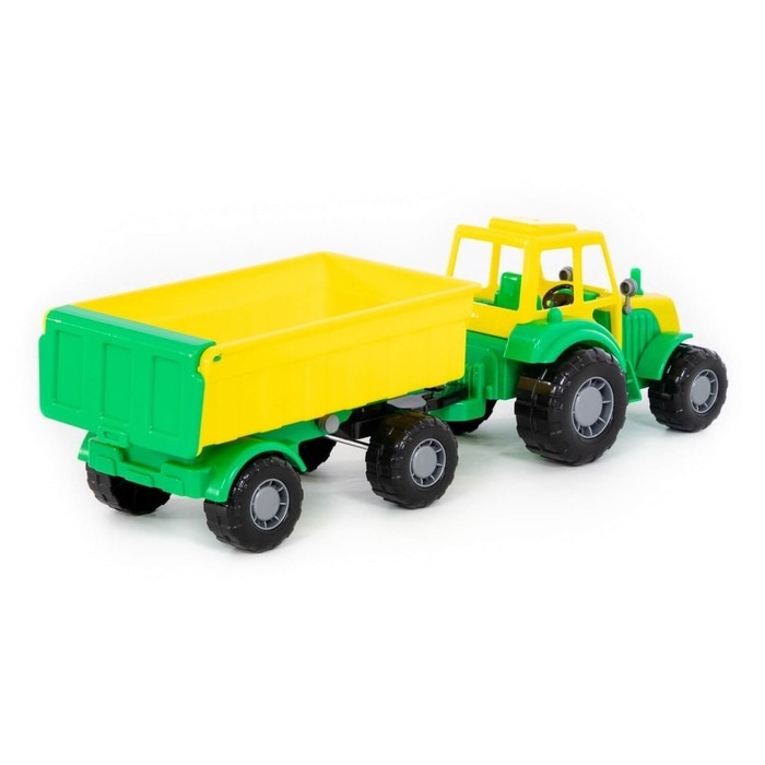 Трактор — это незаменимый вид техники на любой ферме. Он оснащён вместительным прицепом с широкими бортами для перевозки игрушек. Благодаря большим пластиковым колёсам игрушка подойдёт для развлечений дома и на улице.