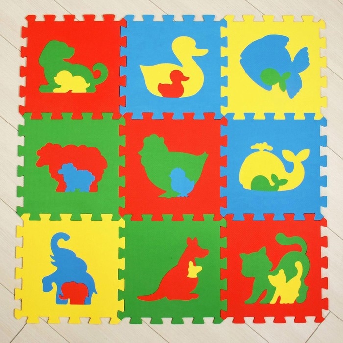 Вместе с этим покрытием покажите малышу новых зверей и их детёнышей. Каждый блок съёмный, вы можете вынимать элементы с животными поменьше и давать задание крохе: расставить их по местам.