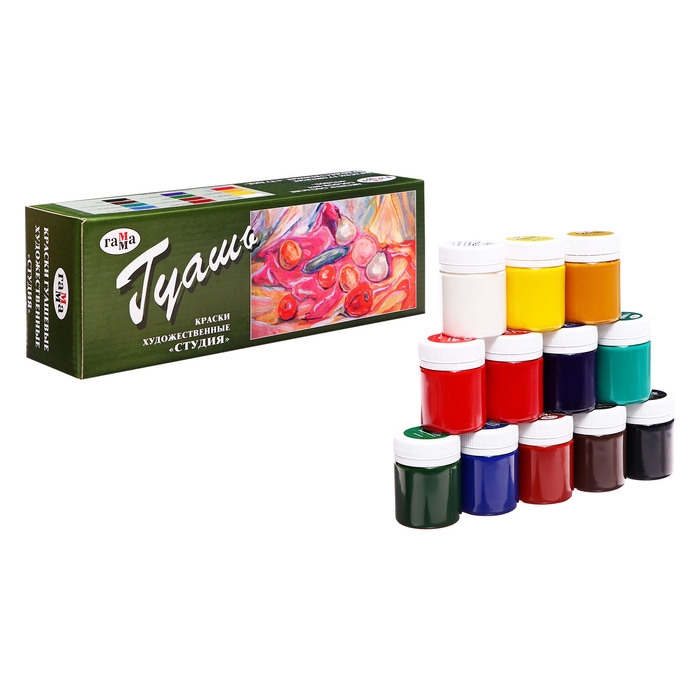 Гуашь художественная "Гамма" серии "Студия" - водорастворимые краски, которые отлично подойдут начинающим художникам и учащимся художественных училищах. Набор гуаши производится по уникальным рецептурам, разработанным собственной лабораторией. Чистые естественные цвета подходят для живописи и декоративно-оформительских работ. Улучшенная адгезия, прекрасная разносимость и высокая светостойкость. При высыхании дают матовый, плотный красочный слой с бархатистым эффектом. В набор гуаши входят 12 цветов. Подойдет как для художественной бумаги, так и для холста. Объём каждой баночки - 40 мл, общий объём - 480 мл.