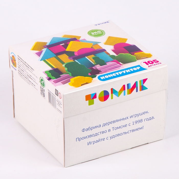 В набор входит 105 деталей, которые сделаны из прочного и экологичного материала — дерева.