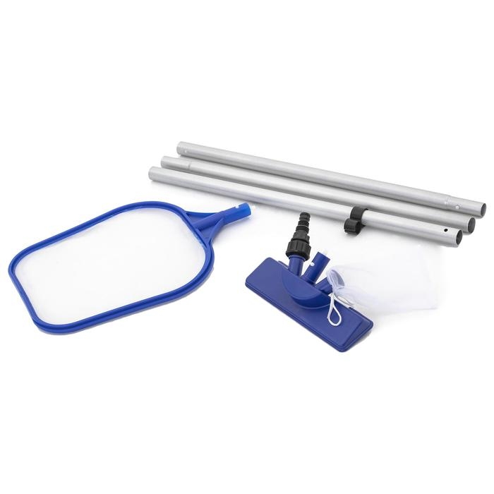 Набор для очистки бассейнов — это необходимый инвентарь, который должен быть у каждого обладателя каркасного или надувного бассейна. С ним вы затратите меньше сил и времени на очистку, а сам процесс пройдёт легко и приятно. Набор состоит из алюминиевой телескопической трубки, с помощью которой вы сможете достать даже до самого дальнего угла бассейна, вакуумной щётки с прозрачным сетчатым мешочком для сбора мусора под водой, а также сачка для улавливания крупного плавающего мусора, например листьев, травы и прочего.
