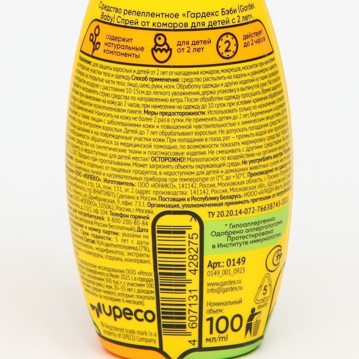 Спрей репеллентный от комаров "Gardex Baby", детский, с календулой и ромашкой, 100 мл