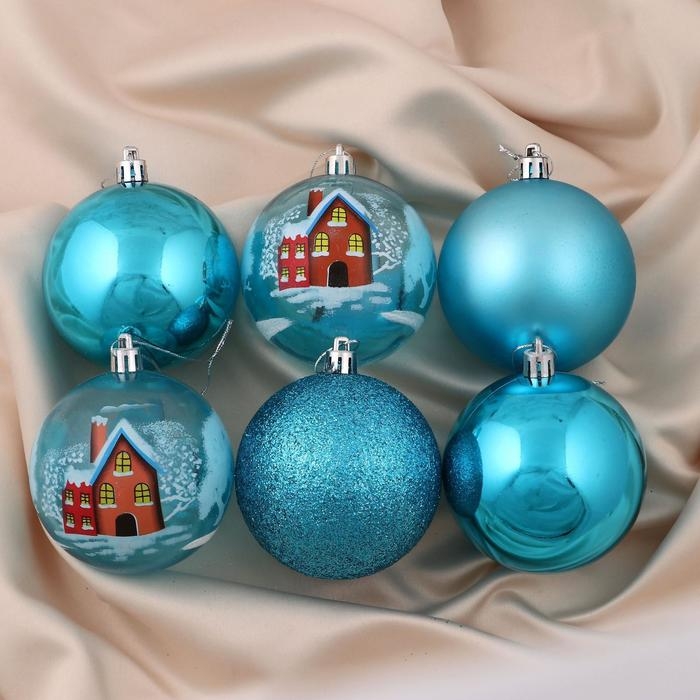 Набор шаров пластик d-8 см, 6 шт "Зимний домик" голубой