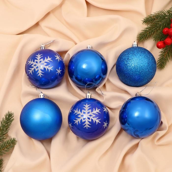 Набор шаров пластик d-8 см, 6 шт "Снежинка капель" синий