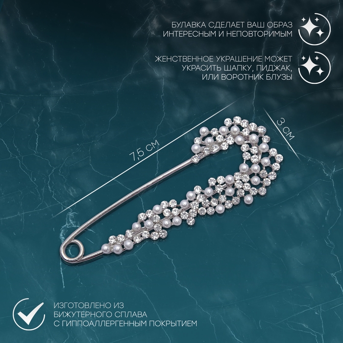 Булавка «Жемчужная россыпь» со стразами, 7,5см, цвет белый в серебре