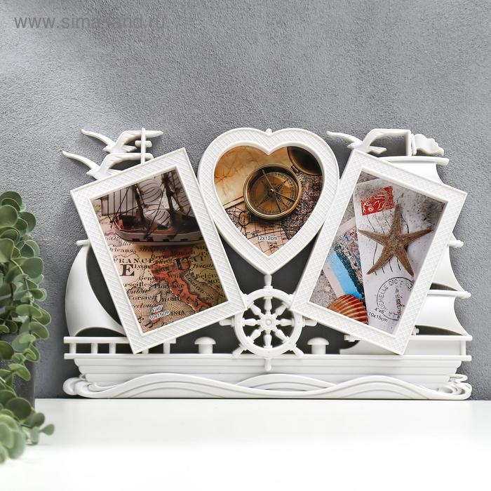 Фоторамка пластик на 3 фото 10х15, 12х12 см "Корабль" белая 25х40 см