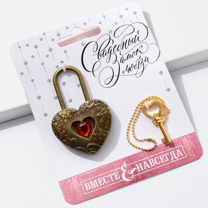 Замок для торжественной свадебной традиции - это символ любви. Навесной замок любви на свадьбе становится символом нерушимого союза, заключенного влюбленными в этот день. По традиции замок вешается на мост, загадывается желание о счастливой семейной жизни, а ключи от него выбрасываются в реку, через левое плечо. Это делается для того, чтобы никто никогда не смог открыть этот замок и нарушить клятву, данную влюбленными. Свадебный замок можно повесить на мост по традиции или на дерево в специалных парках или аллеях молодожен, которые есть во многих городах. Замок навесной свадебный имеет в комплекте ключик, замок закрывается и открывается. Традиция закрывать замок на свадьбу объединяет сердца мужа и жены навсегда. Свадебный декоративный замочек будет отлично смотреться на фотосессии и видео.