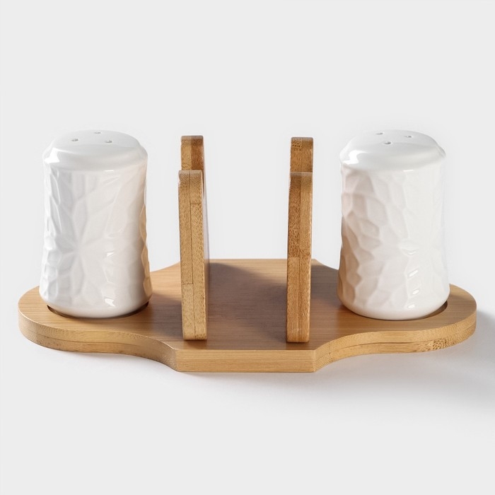 Набор фарфоровый для специй на бамбуковой подставке BellaTenero, 3 предмета: солонка 100 мл, перечница 100 мл, салфетница, цвет белый