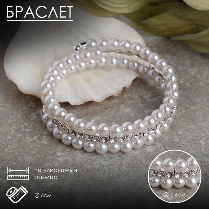 Браслет жемчуг «Пружинка» стразинки, шар №6, цвет белый в серебре, d=6 см
