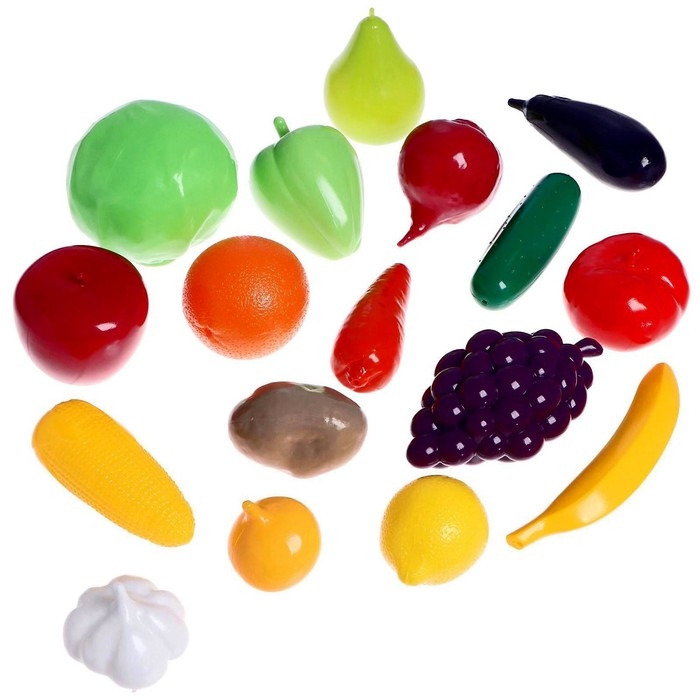 - В наборе представлены различные фрукты и овощи. Это даст ребёнку возможность познакомиться с ними и узнать их название, форму и цвет.