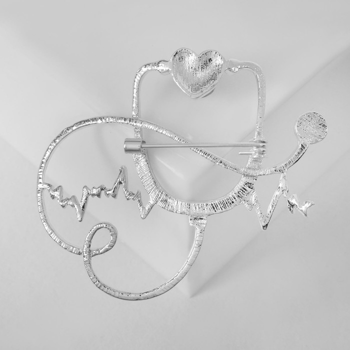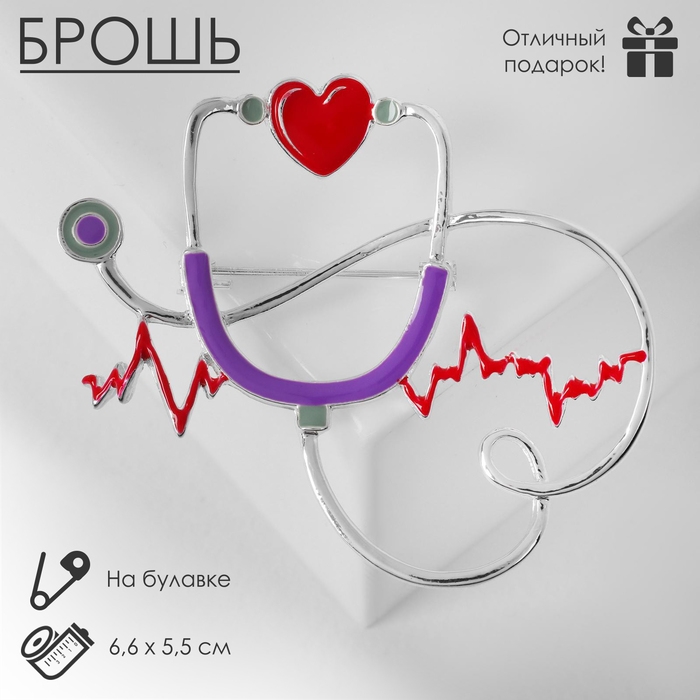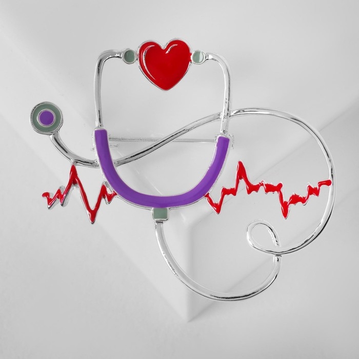 Брошь «Стетоскоп» кардиограмма, цвет красно-сиреневый в серебре