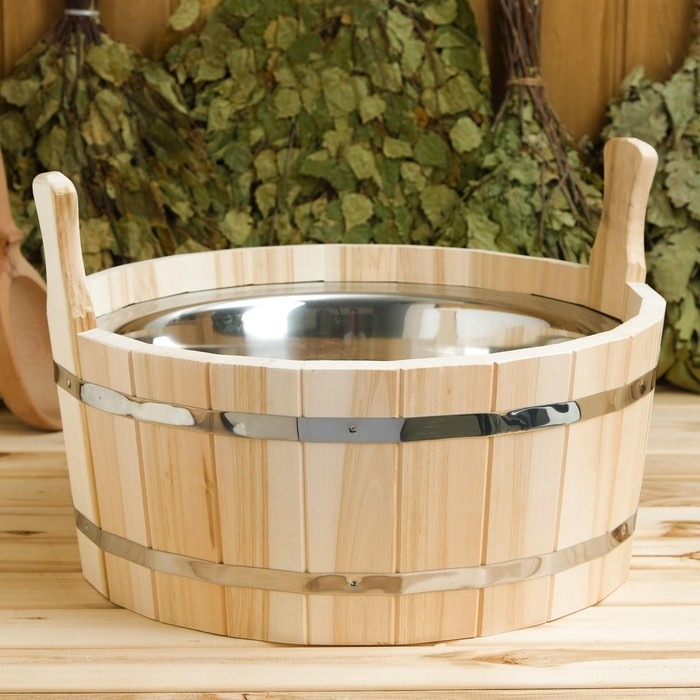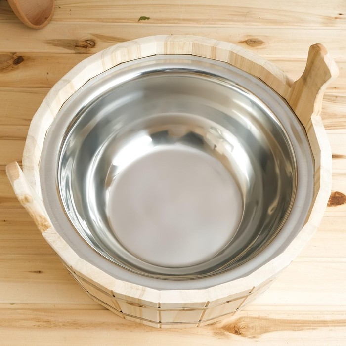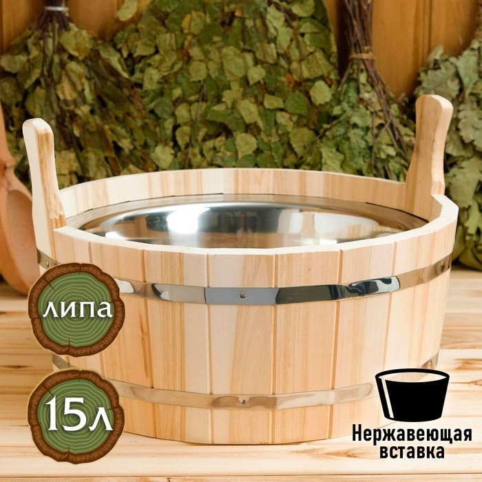 Шайка из липы, 15 л, двуручная, нержавеющая вставка