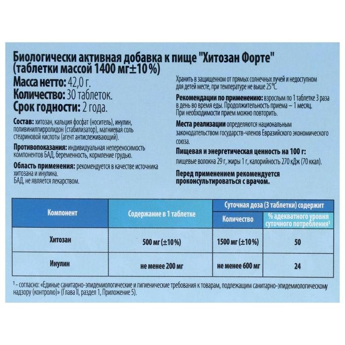 Состав: хитозан, кальция фосфат, инулин, поливинилпирролидон, магниевая соль стеариновой кислоты.