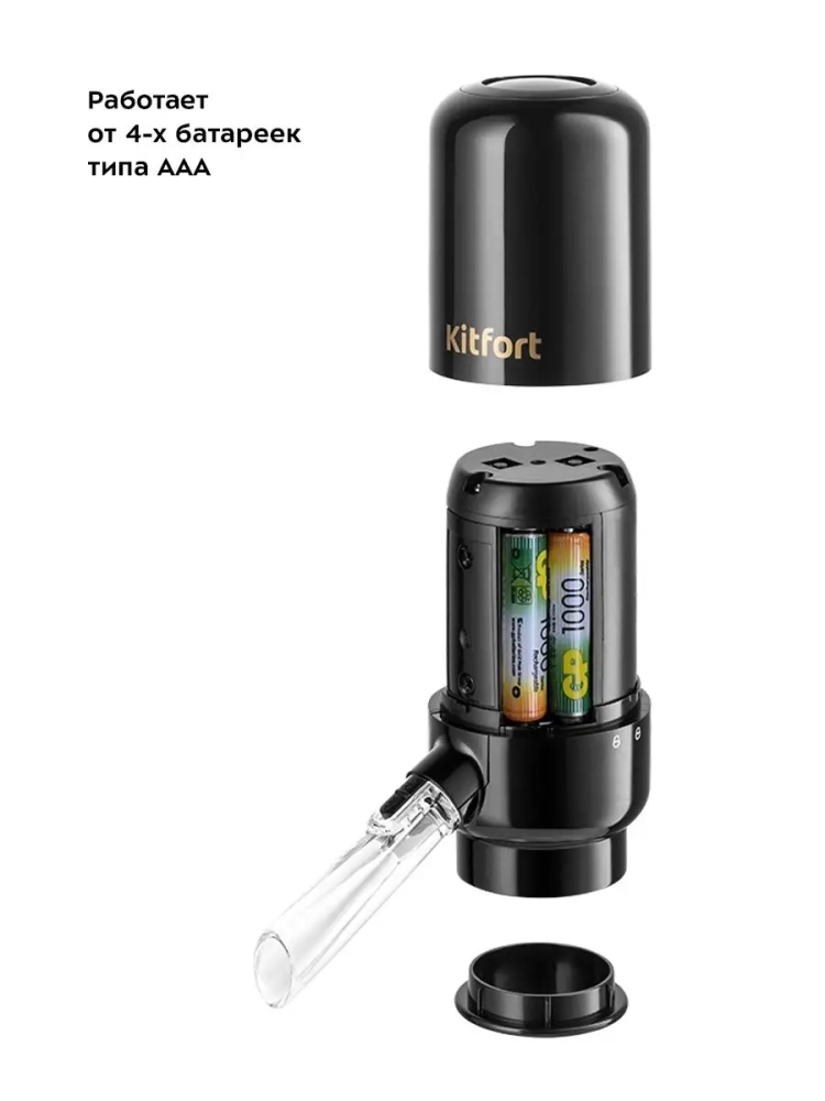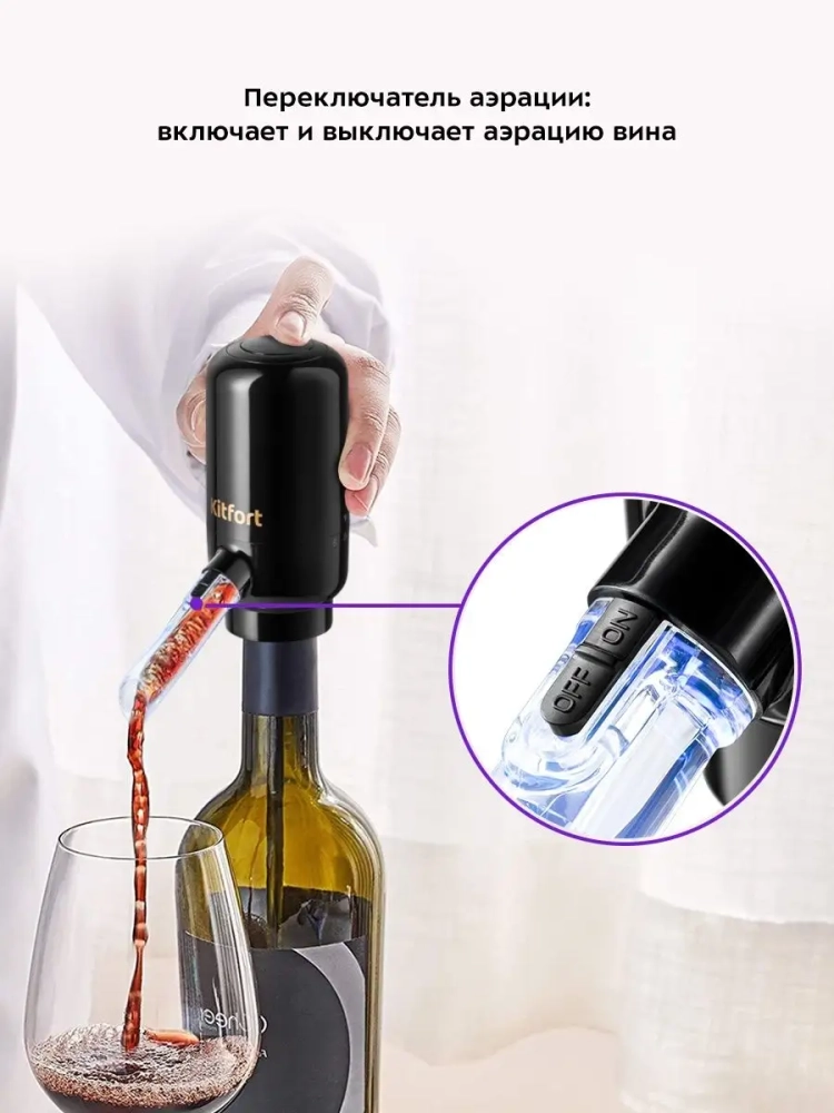 Электрический аэратор для вина Kitfort КТ-4042 — небольшое устройство, которое поможет легко и удобно налить вино в бокал и насытить напиток кислородом. Насыщение кислородом раскрывает вкус и аромат напитка. Сомелье советуют аэрировать многие сорта вин, однако некоторым сортам аэрация может навредить и испортить вкус. Поэтому в электрическом аэраторе функцию аэрации можно отключить. Вы можете ориентироваться на свои вкусовые предпочтения или более подробно изучить рекомендации сомелье в интернете. Принцип действия основан на создании внутри бутылки избыточного давления воздуха, из-за чего вино вытесняется по трубке наружу. Для аэратора KT-4042 важно, чтобы корпус плотно прилегал к горлышку бутылки. Для этого предусмотрено уплотнительное кольцо в месте крепления аэратора на горлышке бутылки. Пользоваться электрическим аэратором очень просто, необходимо надеть его на открытую бутылку, а для подачи вина в бокал — нажать и удерживать кнопку, расположенную на верхней части аэратора. Устройство работает от 4 батареек типа ААА (в комплект не входят). Благодаря питанию от батареек вы можете брать аэратор для вина с собой на пикник или в поездки. Во время работы аэратора включается подсветка трубки подачи вина. Электрический аэратор для вина поможет эффектно подать вино к столу и удивить гостей. Благодаря компактным размерам, его удобно хранить.