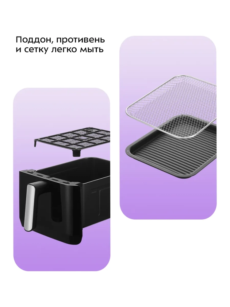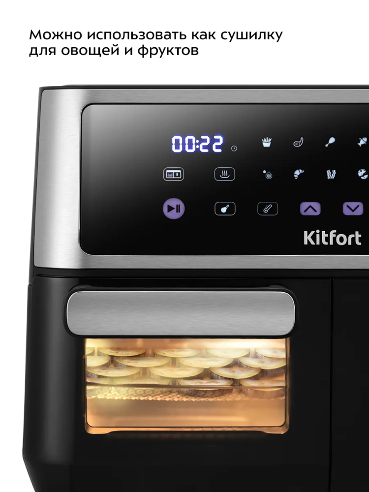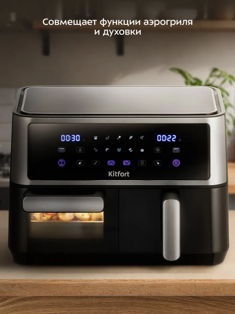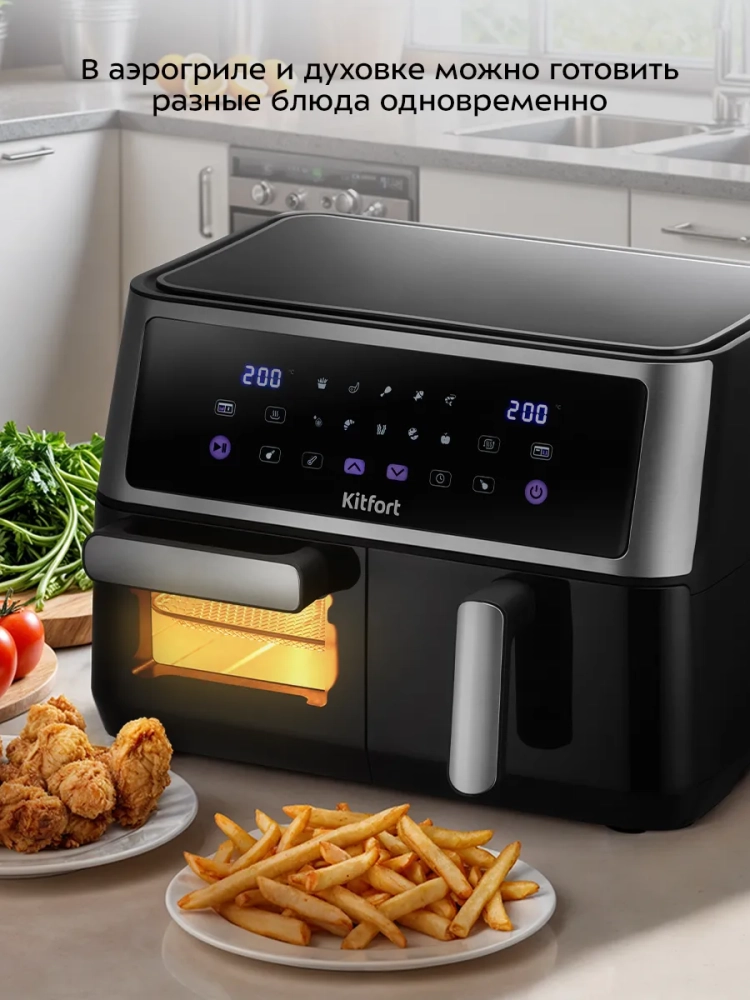 Аэрогриль "2 в 1" Kitfort КТ-2256 – это многофункциональный электрический прибор, который станет незаменимой техникой на вашей кухне. Он совмещает функции аэрогриля и духовки, а также может использоваться как сушилка для овощей и фруктов. Благодаря этому устройству вы сможете готовить большинство блюд, в том числе и выпечку, без масла, сохраняя их полезные свойства. Этот аэрогриль оснащен сенсорным управлением и предлагает 10 автоматических программ приготовления. Температура варьируется от 80 до 200 °С с шагом в 5 °С, что делает его универсальным для различных рецептов. В режиме сушки температура регулируется от 50 до 80 градусов с таймером от 1 до 24 часов. Особенность данного устройства заключается в наличии двух независимых частей с отдельными нагревателями, что позволяет одновременно готовить два разных блюда. Это удобно для тех случаев, когда нужно приготовить основное блюдо и гарнир к одному времени. Емкость поддона составляет целых пять литров, а чаша духовки – шесть литров. Решетка размером 230 х 190 мм обеспечивает равномерное распределение горячего воздуха по всей поверхности продуктов благодаря системе циркуляции воздуха продукты обжариваются со всех сторон равномерно и получаются нежными внутри с хрустящей корочкой снаружи. Этот электрический аэрогриль Kitfort станет незаменимым прибором на вашей кухне благодаря своей многофункциональности: он заменяет сразу несколько устройств – гриль, духовку и сушилку! Поддон легко моется после использования.