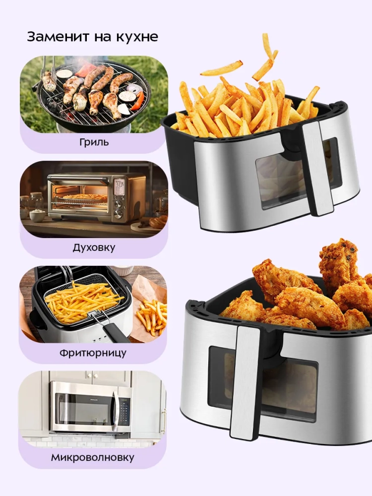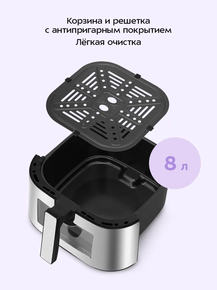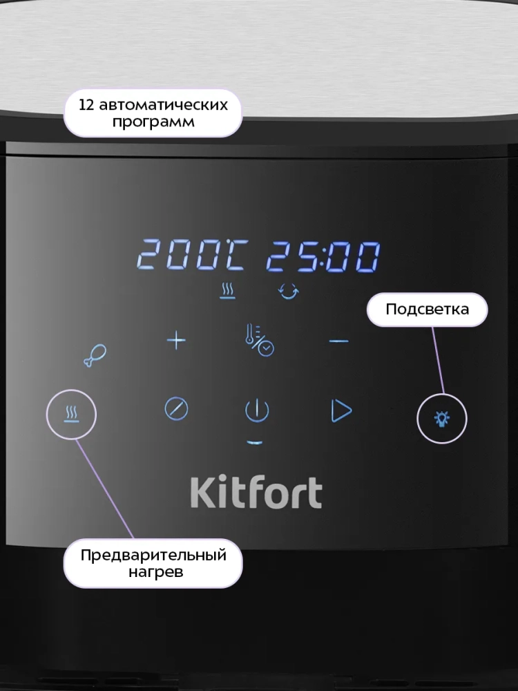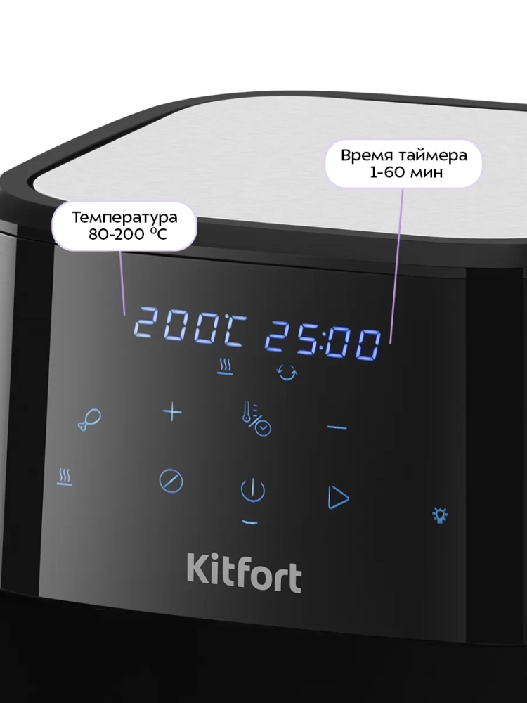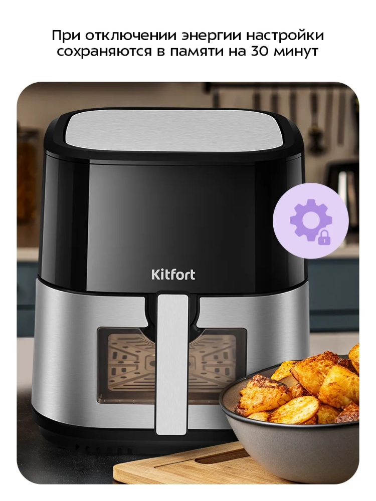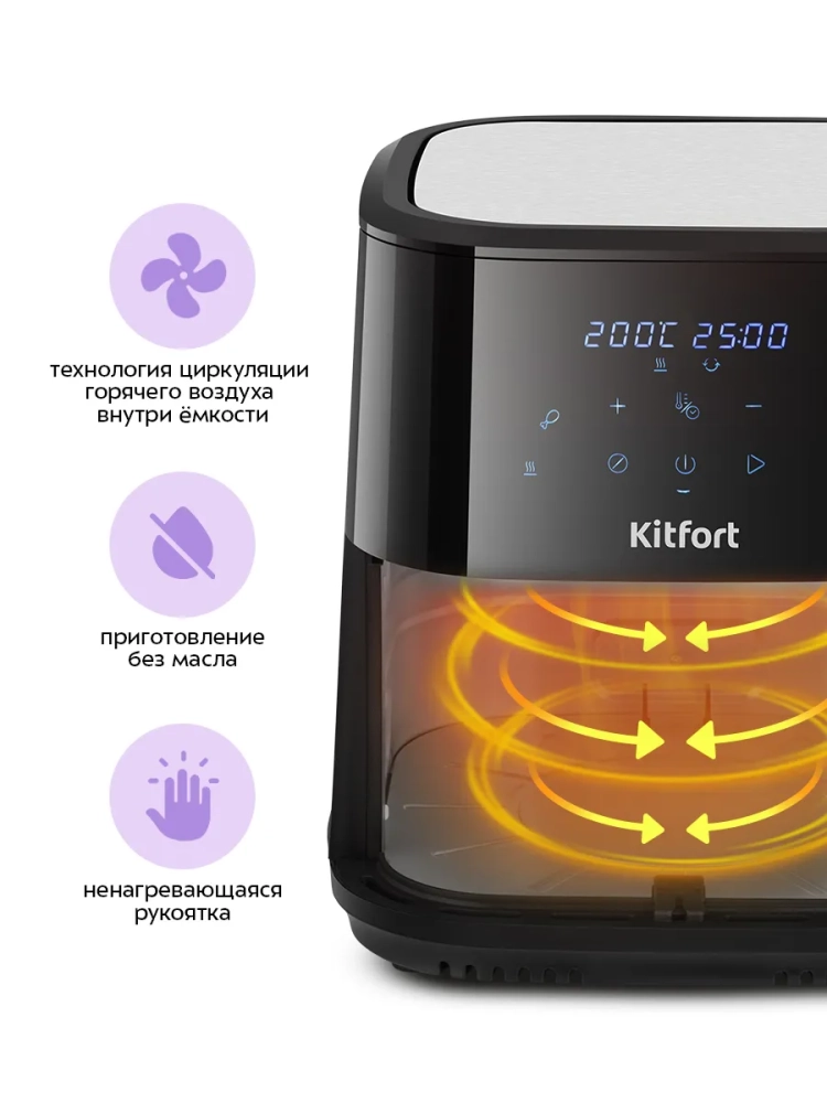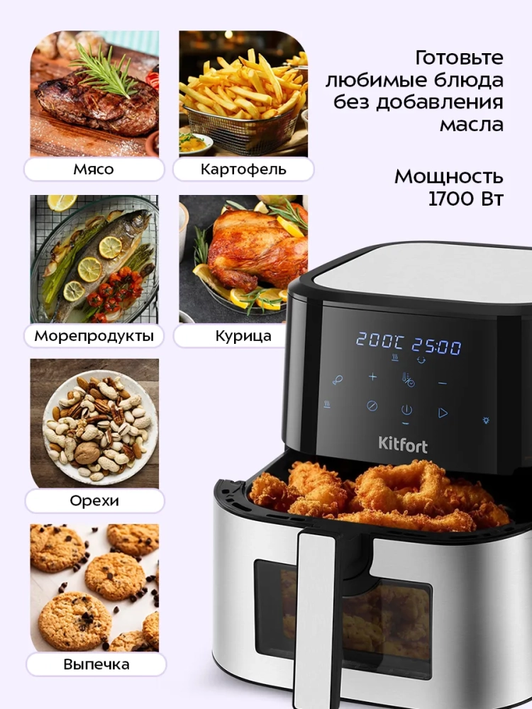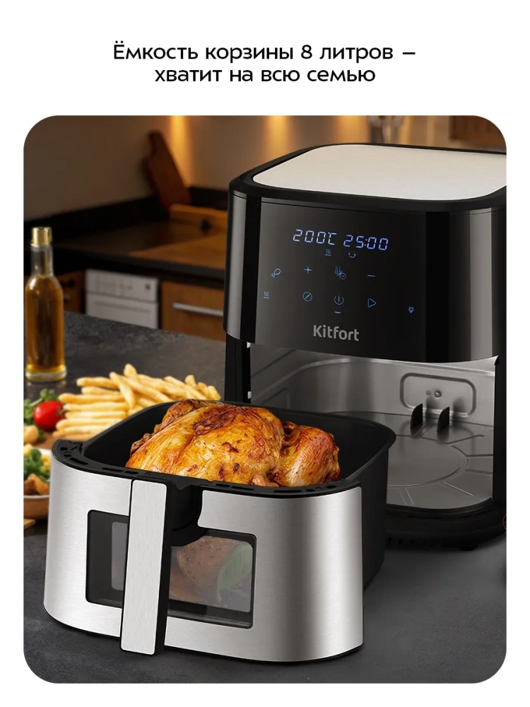 Аэрогриль электрический Kitfort КТ-2266 — это современное бытовое устройство, которое станет незаменимым помощником на вашей кухне. С его помощью вы сможете готовить разнообразные блюда без добавления масла, сохраняя их сочность и создавая аппетитную хрустящую корочку. Этот аэрогриль оснащен системой циркуляции горячего воздуха, что обеспечивает равномерное обжаривание продуктов со всех сторон. В результате ваши блюда будут нежными внутри и хорошо запеченными снаружи. Электрический аэрогриль Kitfort предлагает 12 автоматических программ приготовления, включая функции предварительного нагрева и напоминания о перемешивании. Это позволяет использовать готовые шаблоны настроек для различных блюд, таких как пицца или выпечка, не задумываясь о температуре и времени приготовления. На дисплее отображаются текущие параметры процесса. Продукты размещаются на специальной решетке для гриля в поддоне с антипригарным покрытием. Это предотвращает пригорание пищи даже при минимальном количестве масла. Поддон легко вынимается для очистки после использования. С мощностью 1700 Вт и емкостью поддона 8 литров этот кухонный прибор позволяет приготовить большое количество еды за один раз. Температура разогрева регулируется от 80 до 200 °С с шагом в 5 °С, а таймер можно установить до 60 минут с шагом в одну минуту. Аэрогриль Kitfort — это надежная техника для вашей кухни! Электрогриль автоматически отключается по окончании приготовления блюд, обеспечивая безопасность использования.