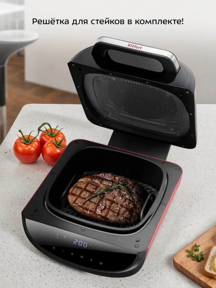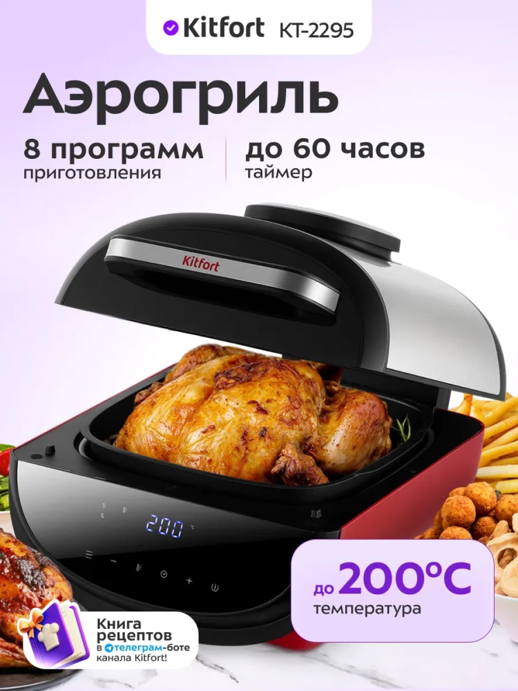 Аэрогриль электрический Kitfort КТ-2295 — это инновационный прибор для вашего дома, который станет незаменимым помощником на кухне. С помощью этой универальной техники вы сможете готовить разнообразные блюда без добавления масла, сохраняя их сочность и создавая аппетитную хрустящую корочку. Этот аэрогриль идеально подходит для кухни благодаря своей компактности и функциональности. Система циркуляции горячего воздуха обеспечивает равномерное обжаривание продуктов со всех сторон, делая их нежными внутри и хорошо запеченными снаружи. Благодаря этому прибору вам не придется постоянно находиться на кухне — достаточно правильно выставить температуру и время приготовления. Аэрогриль оснащен сенсорным управлением и дисплеем, что делает его использование максимально удобным. В комплекте с аэрогрилем идет специальная решетка, установленная в поддон с антипригарным покрытием. Это позволяет легко извлекать продукты после приготовления и мыть комплектующие без лишних усилий. Поддон имеет емкость 6,5 литров, что позволяет готовить большие порции за один раз. Электрический аэрогриль Kitfort предлагает 8 автоматических программ приготовления для различных блюд: от выпечки до жарки мяса или рыбы в режиме гриля. Встроенный термощуп помогает контролировать степень прожарки стейков или других продуктов без риска испортить их внешний вид. Этот бытовой настольный прибор обладает мощностью 1700 Вт. Температурный диапазон составляет от 80 до 200 °С, а таймер рассчитан на работу до 60 минут.
