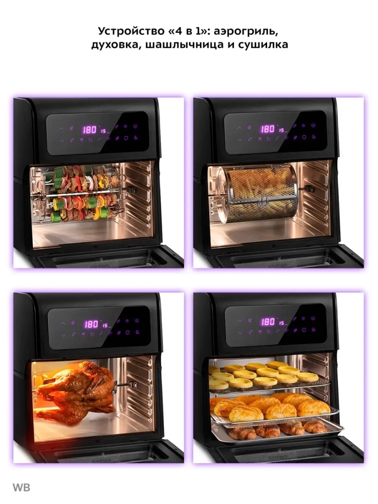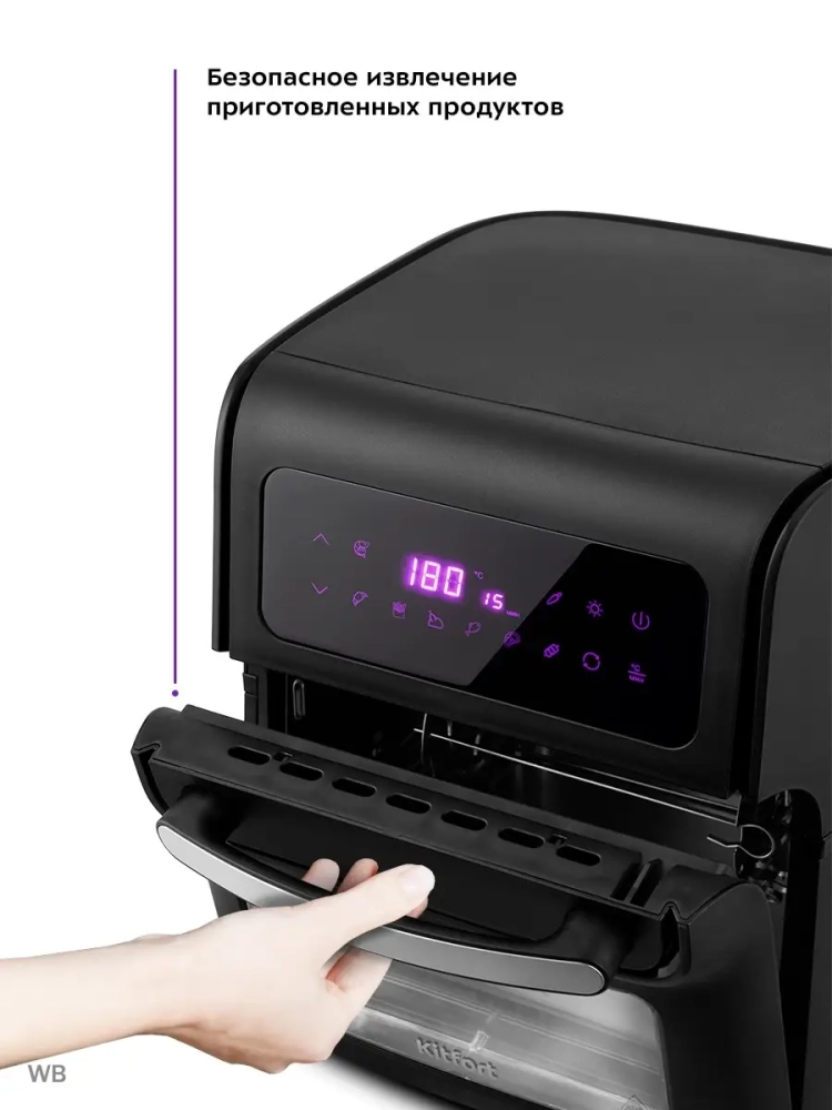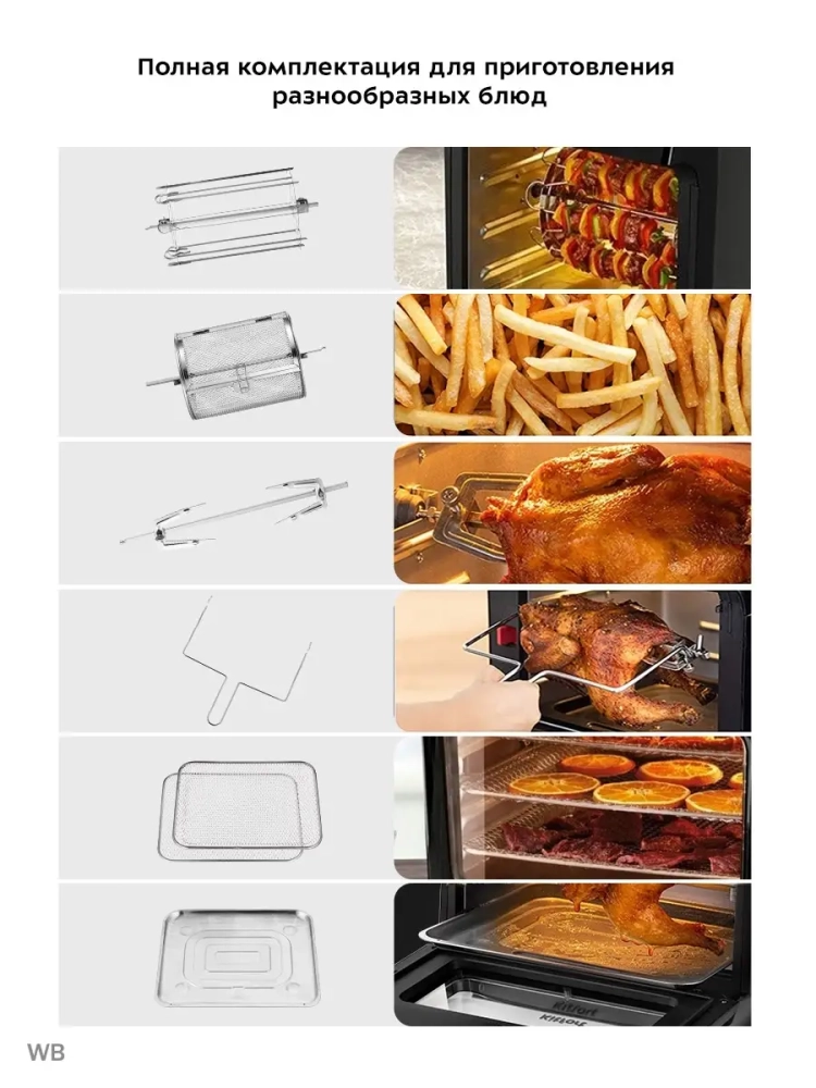 Аэрогриль Kitfort KT-2236 — это многофункциональный электрический прибор, который станет незаменимым помощником на вашей кухне. Он совмещает в себе функции аэрогриля, электрогриля, духовки, сушилки для овощей и фруктов и шашлычницы, что позволяет готовить разнообразные блюда с минимальными усилиями. Объем камеры составляет 15 литров, что дает возможность готовить большие порции пищи. В комплекте с аэрогрилем идут решетка и сетчатый противень для выпечки или сушки продуктов. Вертел с вилками идеально подходит для приготовления курицы-гриль или крупных кусков мяса. Шампуры позволяют приготовить вкусный шашлык прямо у вас дома. Также предусмотрена вращающаяся корзина для жарки овощей, картофеля фри и других продуктов. Для удобства использования аэрогриль оснащен электронным управлением и дисплеем, а также имеет 8 автоматических программ приготовления и возможность ручной настройки параметров. Система циркуляции горячего воздуха обеспечивает равномерное обжаривание продуктов со всех сторон, создавая хрустящую корочку снаружи и сохраняя нежность внутри. Специальный поддон собирает стекающий жир и соки во время приготовления, предотвращая загрязнение внутренней поверхности прибора. Размеры поддона составляют 295 х 255 х 17 мм. Аэрогриль Kitfort KT-2236 — это не только гриль или фритюрница; он также может использоваться как кухонная духовка для выпечки различных блюд благодаря широкому диапазону температур от 75 до 200°C с шагом регулировки в 5°C. Таймер позволяет установить время приготовления от одной до шестидесяти минут.