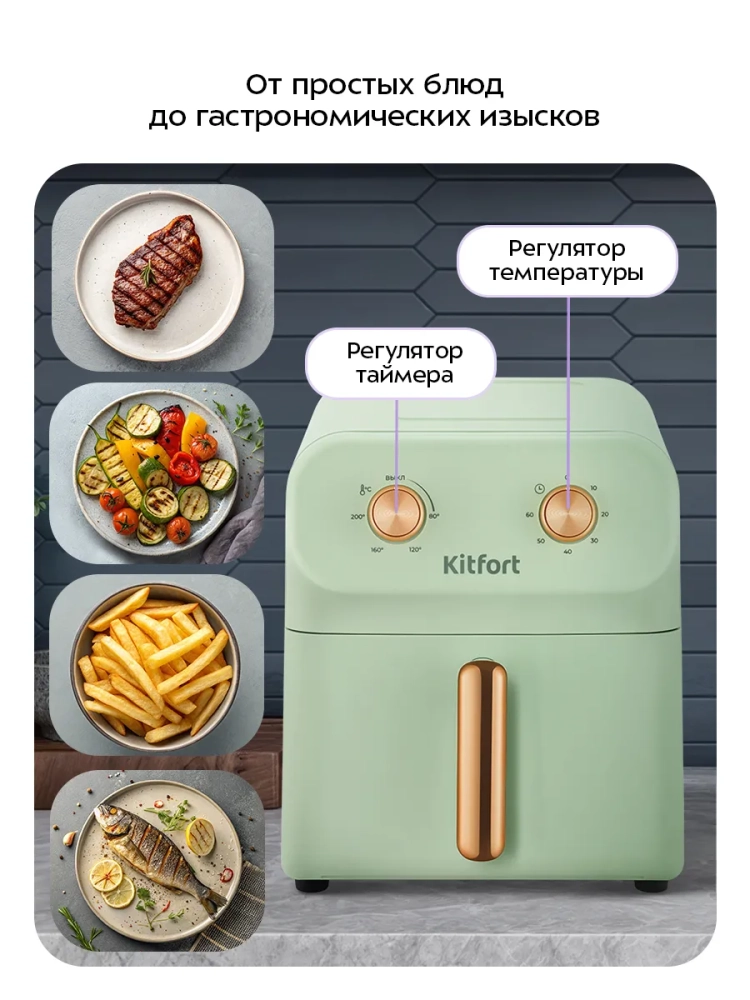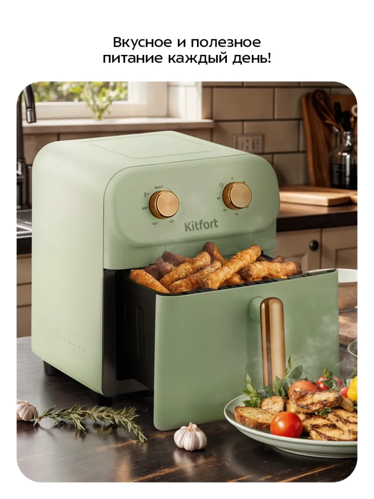 Аэрогриль электрический Kitfort КТ-2262 — это современный кухонный прибор, который позволяет готовить разнообразные блюда без добавления масла. Благодаря этому аэрогрилю, ваши блюда будут сочными и с хрустящей корочкой. Этот электрический аэрогриль оснащен системой циркуляции горячего воздуха, что обеспечивает равномерное обжаривание продуктов в гриле со всех сторон. В результате вы получаете нежные внутри и хорошо запеченные снаружи блюда. Прибор имеет механическое управление, позволяющее установить температуру от 80 до 200 °С и время приготовления до 60 минут. Это делает процесс готовки простым и удобным даже для новичков на кухне. Аэрогриль Kitfort КТ-2262 оборудован специальной решеткой и поддоном с антипригарным покрытием, которые легко вынимаются для мытья. Емкость поддона составляет 6 литров, что позволяет готовить большие порции за один раз. Мощность устройства варьируется от 1500 до 1700 Вт. Длина шнура составляет 0,8 м, а размеры устройства — компактные: всего лишь 325 х 250 х 265 мм. Этот настольный электрогриль идеально подходит для выпечки или жарки мяса без лишнего жира благодаря возможности использования минимального количества масла или его полного отсутствия. Поддон вмещает достаточно продуктов для всей семьи или компании друзей. Техника Kitfort КТ-2262 станет незаменимым помощником на вашей кухне благодаря своей функциональности и простоте использования! Он автоматически отключается по окончании приготовления пищи.