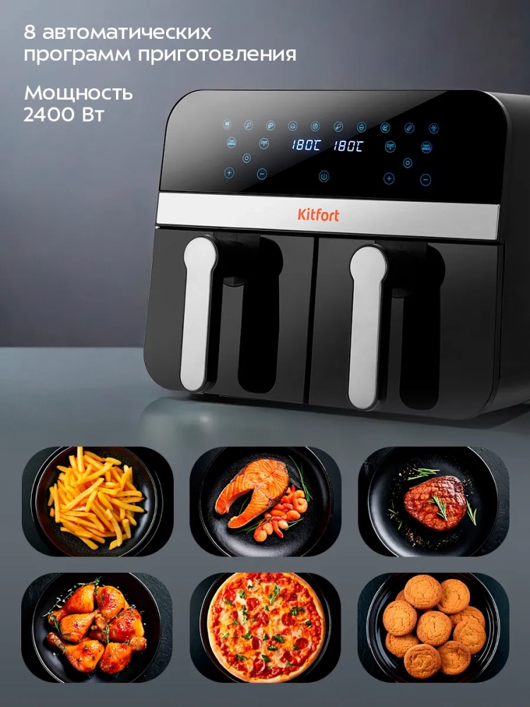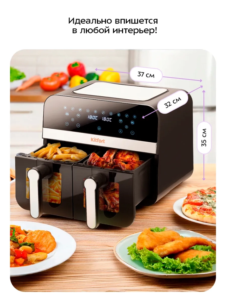Современный аэрогриль Kitfort КТ-2272 позволяет готовить большинство продуктов без добавления масла, при этом они получаются сочными и с хрустящей корочкой.