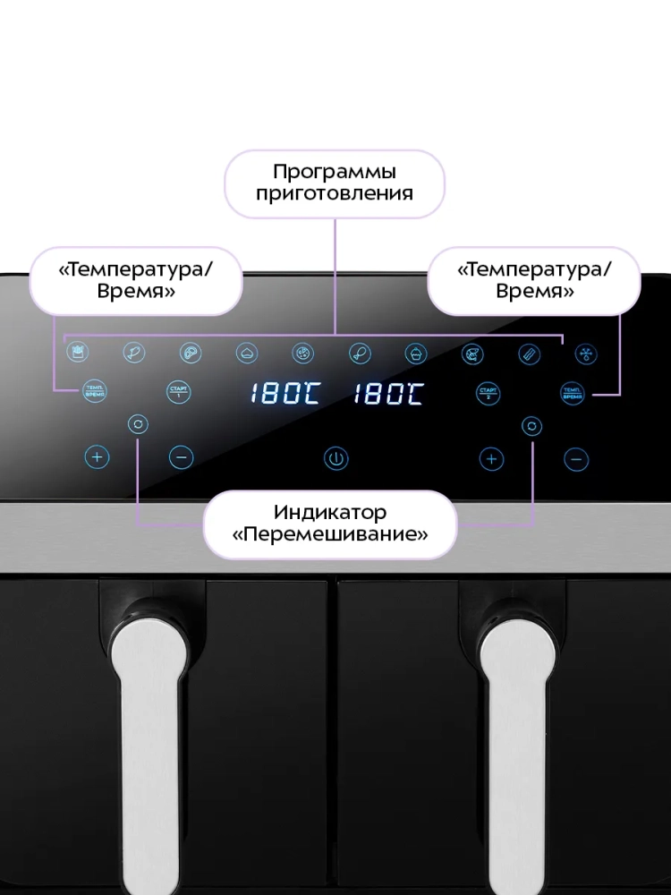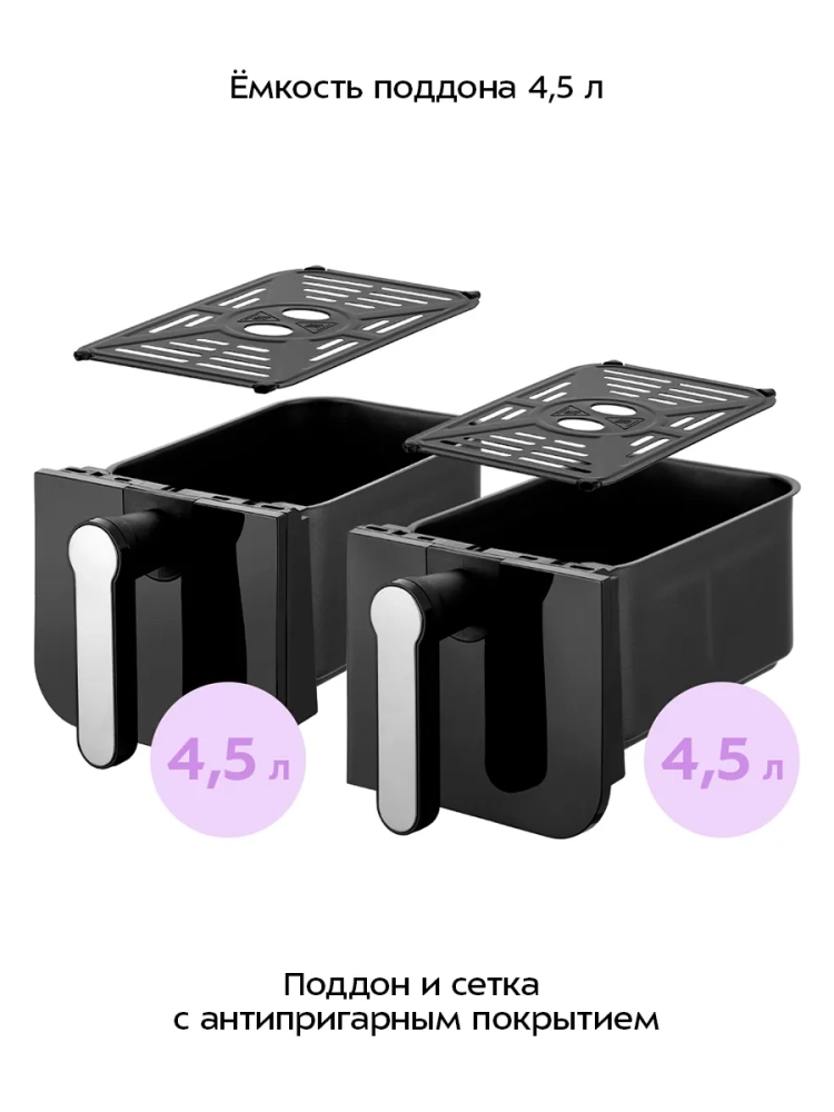 Главное преимущество данного аэрогриля заключается в том, что у него имеется два нагревателя (левый и правый) и два поддона. Благодаря двум поддонам вы можете готовить 2 блюда одновременно, установив при этом для каждого свои настройки температуры и времени.