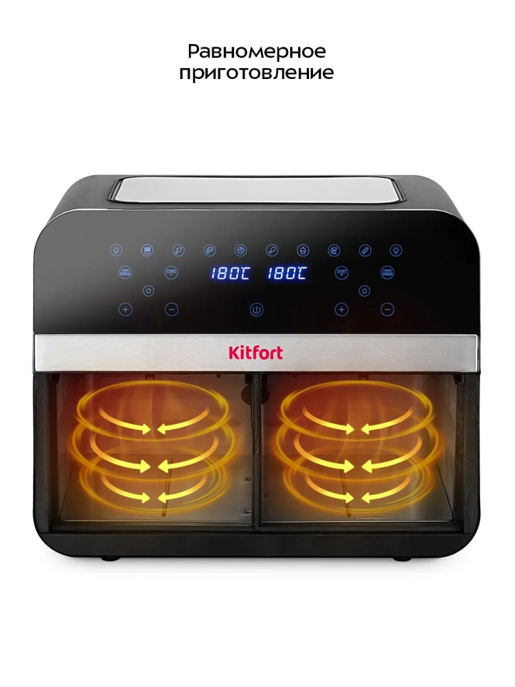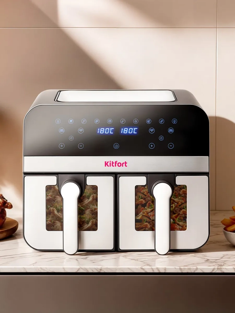 Аэрогриль электрический Kitfort КТ-2273 – это современный прибор с 2 чашами, который станет незаменимым помощником на вашей кухне. С его помощью вы сможете готовить на гриле разнообразные блюда без добавления масла, сохраняя их сочность и создавая аппетитную хрустящую корочку. Благодаря системе циркуляции горячего воздуха продукты равномерно обжариваются со всех сторон, оставаясь нежными внутри и хорошо запеченными снаружи. Этот аэрогриль оснащен двумя нагревателями мощностью по 1200 Вт каждый и двумя поддонами с общей емкостью 9 литров (2 × 4,5 л), что позволяет одновременно готовить два разных блюда с индивидуальными настройками температуры и времени. Сенсорное управление облегчает использование устройства: вы можете выбрать одну из восьми автоматических программ или настроить параметры вручную. На дисплее отображаются температура и время приготовления, что делает процесс максимально удобным. Продукты размещаются на специальных решетках в поддонах с антипригарным покрытием, предотвращающим пригорание пищи. После завершения процесса приготовления аэрогриль автоматически отключается для безопасности использования. Грильница Kitfort КТ-2273 также может использоваться как фритюрница и электрогриль благодаря своей универсальности. Поддон легко вынимается для очистки после использования. Мощность устройства составляет 2400 Вт (по 1200 Вт на каждый нагреватель) благодаря встроенному тэну, а напряжение – ~220–240 В при частоте 50/60 Гц. Температурный диапазон от 80 до 200 °С регулируется с шагом в пять градусов, а таймер можно установить от одной до шестидесяти минут с шагом в одну минуту. Этот кухонный прибор станет незаменимой техникой на вашей кухне благодаря своим возможностям выпечки и жарки без лишних усилий!