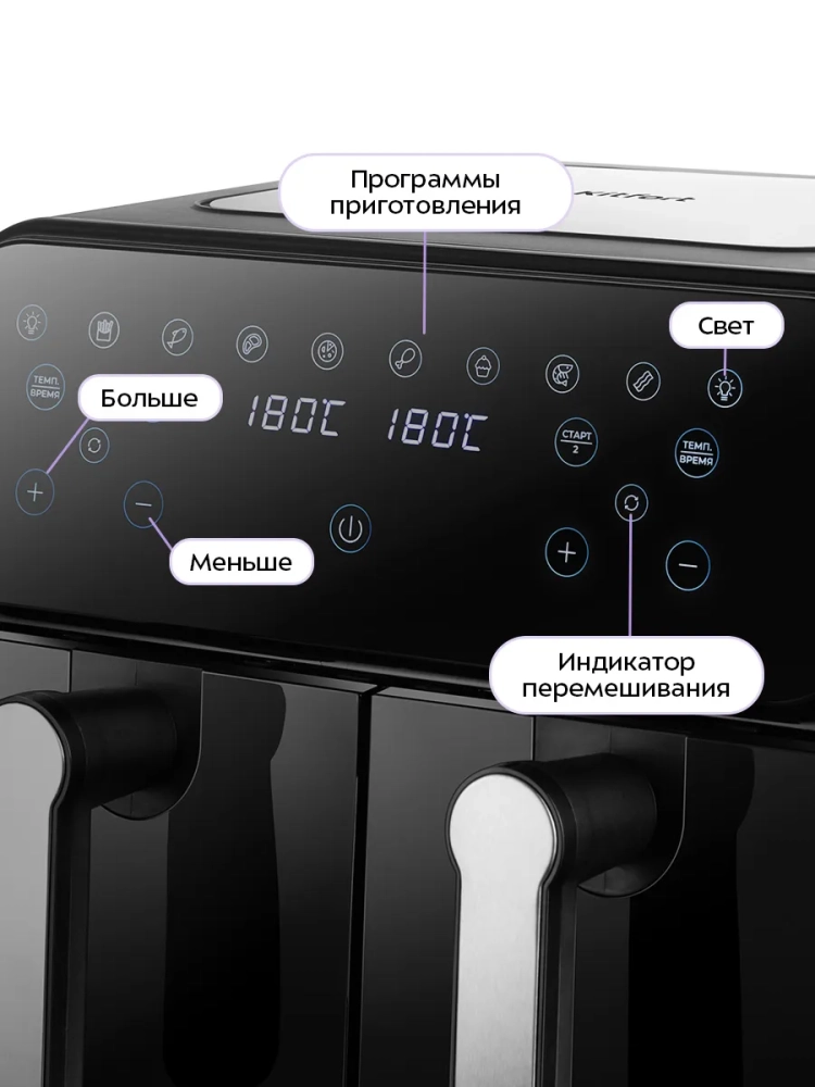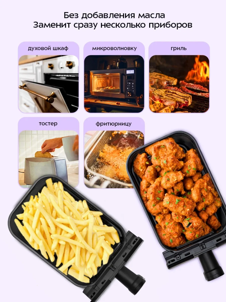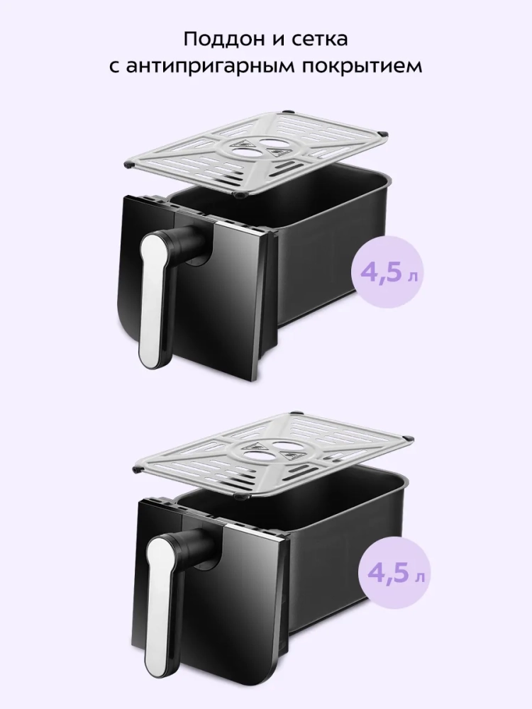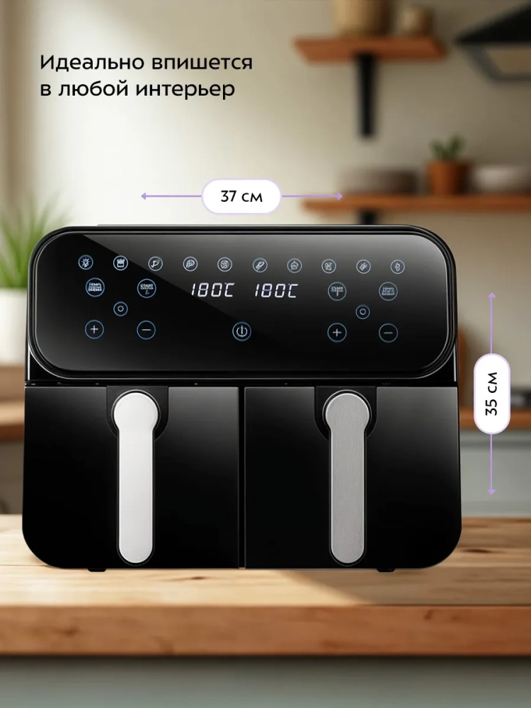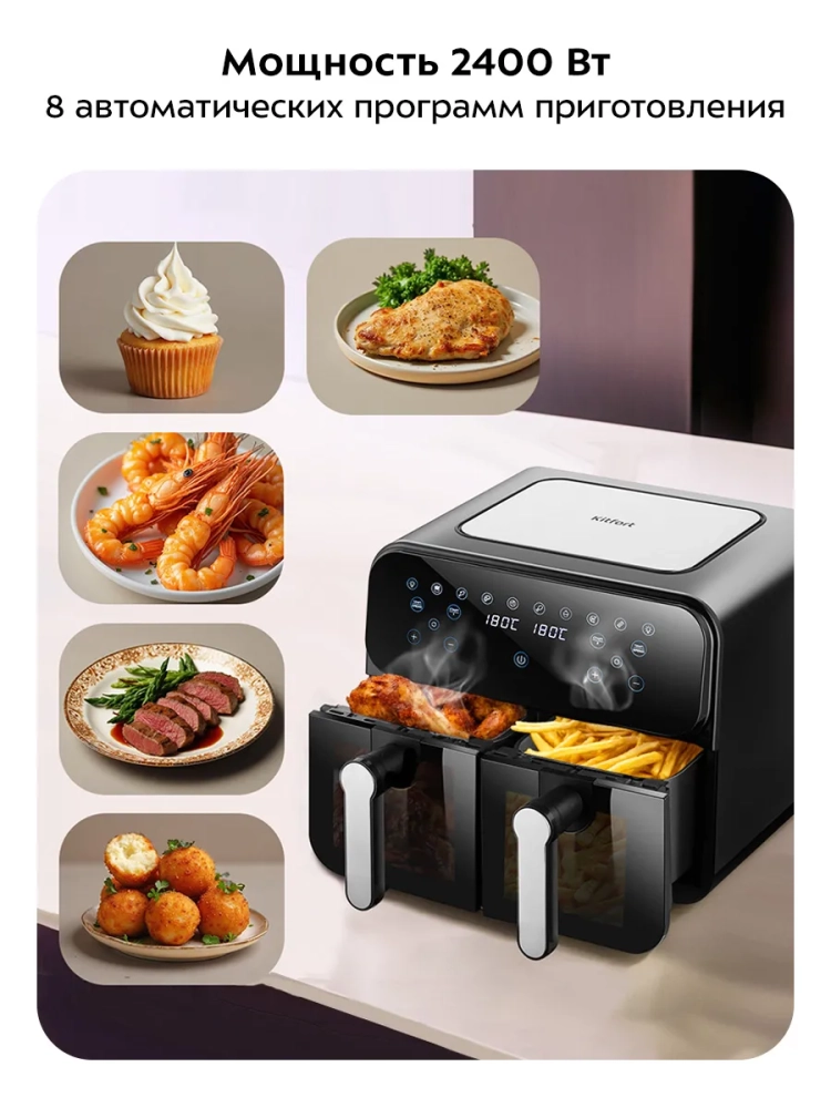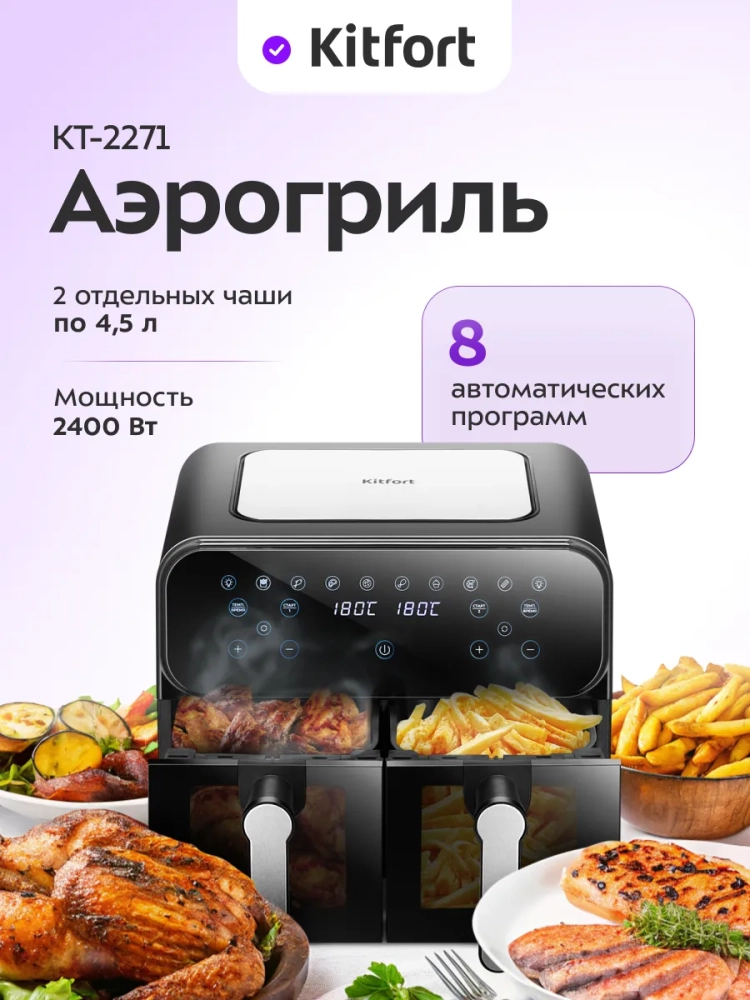 Аэрогриль электрический Kitfort КТ-2271 — это современное устройство для вашей кухни, которое позволяет готовить разнообразные блюда без добавления масла. Благодаря системе циркуляции горячего воздуха продукты в гриле обжариваются равномерно, оставаясь сочными внутри и с хрустящей корочкой снаружи. Этот кухонный прибор оснащен двумя нагревателями и двумя поддонами, что позволяет одновременно готовить два разных блюда с индивидуальными настройками температуры и времени. Сенсорное управление аэрогриля делает процесс приготовления простым и удобным. Восемь автоматических программ позволяют выбрать оптимальные параметры для различных блюд, избавляя вас от необходимости постоянного контроля за процессом. На дисплее отображаются текущие настройки температуры и времени приготовления. Продукты размещаются на специальных решетках в поддонах, которые имеют антипригарное покрытие для легкого ухода после использования. Поддоны легко вынимаются и моются, обеспечивая чистоту на вашей кухне. Мощность устройства составляет 2400 Вт благодаря встроенному тэну, что обеспечивает быстрое приготовление пищи. Емкость поддонов — 9 литров (по 4,5 литра каждый), что достаточно для приготовления больших порций еды на всю семью или компанию друзей. Этот настольный электрогриль станет незаменимым помощником в вашем доме благодаря своей функциональности и простоте использования. Он идеально подходит как для повседневного использования на кухне, так и для особых случаев.