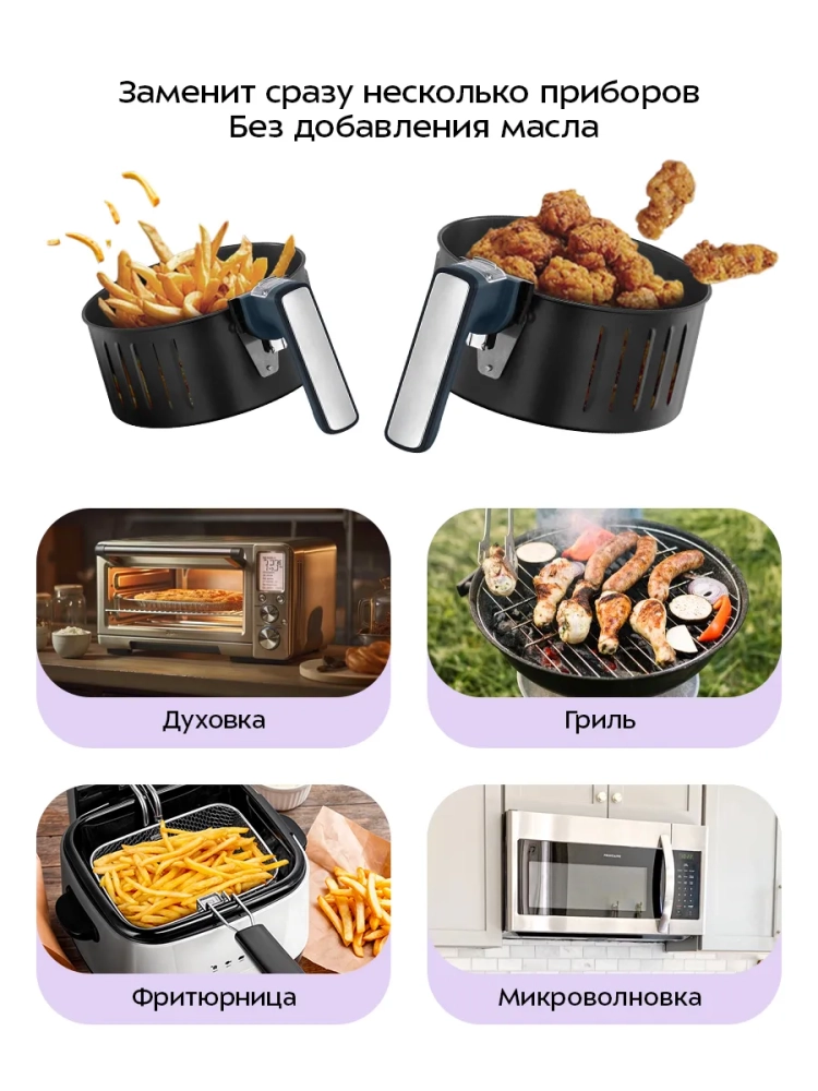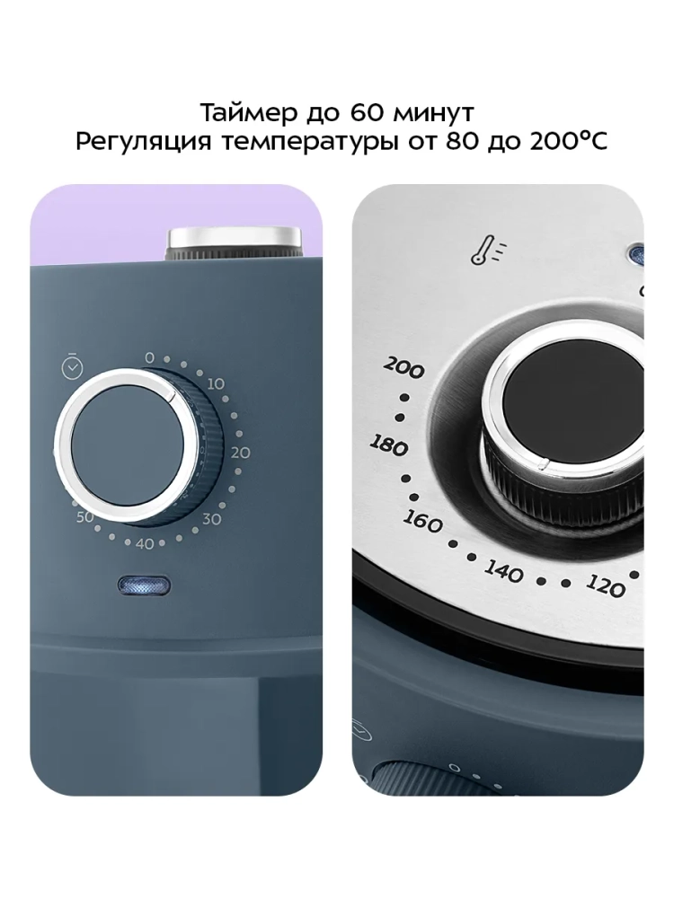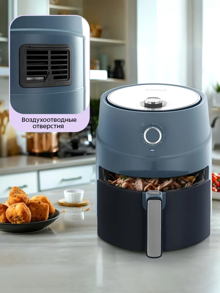Аэрогриль электрический Kitfort КТ-8118 — это современный кухонный прибор, который станет незаменимым помощником на вашей кухне. С его помощью можно готовить большинство блюд без добавления масла, сохраняя их сочность и создавая аппетитную хрустящую корочку. Этот прибор позволяет приготовить более здоровую пищу благодаря системе циркуляции горячего воздуха, которая равномерно обжаривает продукты со всех сторон. Электроаэрогриль оснащен механическим управлением, что позволяет легко установить температуру от 80 до 200 °С и время приготовления до 60 минут. Это бытовое устройство идеально подходит для тех, кто ценит удобство и простоту в использовании. Продукты готовятся в специальной корзине с антипригарным покрытием, установленной в поддон. Поддон также имеет антипригарное покрытие и легко моется после использования. Его емкость составляет 3,2 литра — идеальный объем для приготовления разнообразных блюд на семью или небольшую компанию друзей. Аэрогриль автоматически отключается по окончании процесса готовки, обеспечивая безопасность использования. Этот настольный гриль не требует постоянного присутствия на кухне благодаря встроенному вентилятору: все блюда получаются равномерно прожаренными без непропеченных участков. Размер устройства составляет всего 280 х 351 х 340 мм при длине шнура в 0,6 м — компактные габариты позволяют разместить его даже на небольшой кухне.