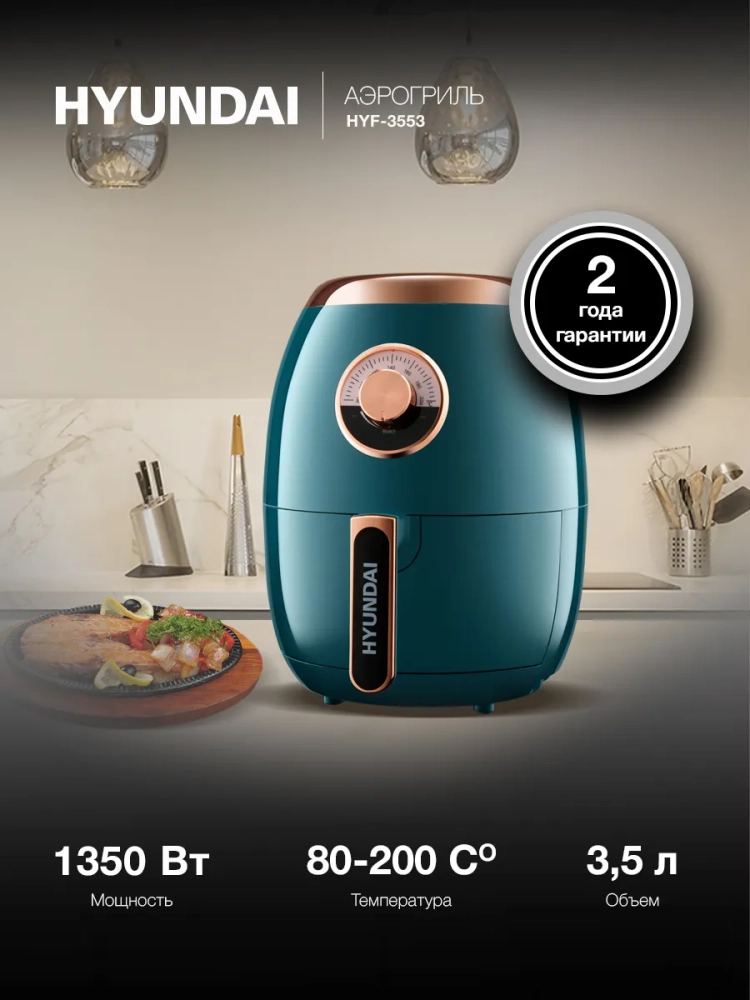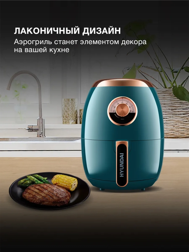 Аэрогриль Hyundai HYF-3553 темно-зеленый/золотистый, мощность 1350Вт, нагревательный элемент: ТЭН. Съёмный поддон имеет антипригарное покрытие, благодаря чему он легко отмываются после использования.