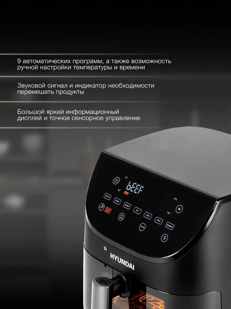 Аэрогриль Hyundai HYF-9090 станет стильным и функциональным помощником на вашей кухне — для ежедневных ужинов и праздничных блюд.