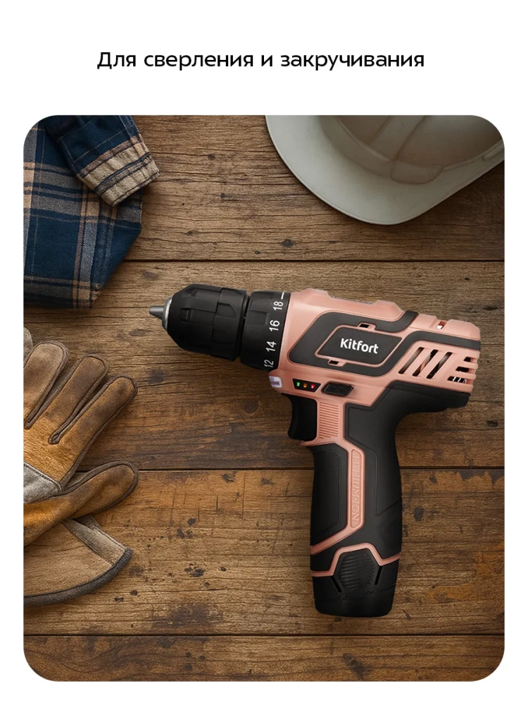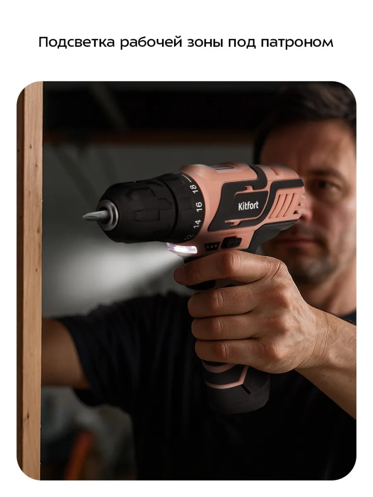 Аккумуляторная дрель-шуруповерт Kitfort КТ-6493 поможет вам провести ремонтные работы или собрать мебель. С ней вы легко и быстро сможете закрутить или выкрутить шурупы или винты, а также просверлить отверстия в разных поверхностях. Благодаря подсветке в верхней части устройства будет удобно работать даже в плохо освещенных местах. Подсветка загорается вместе с включением дрели-шуруповерта.