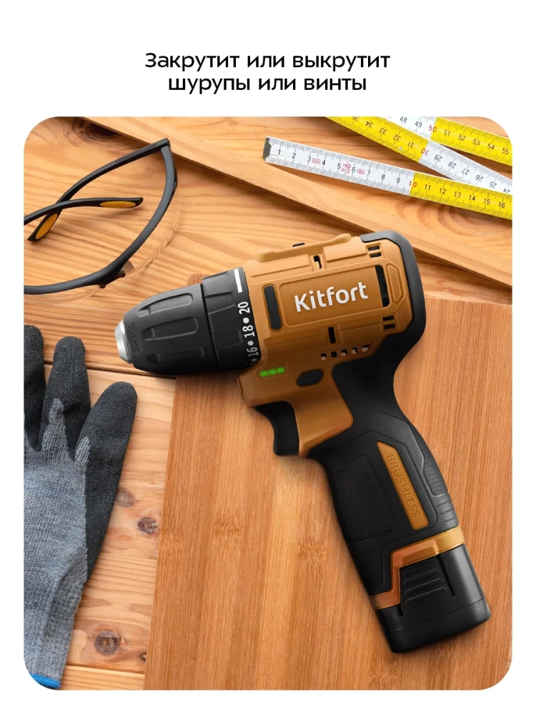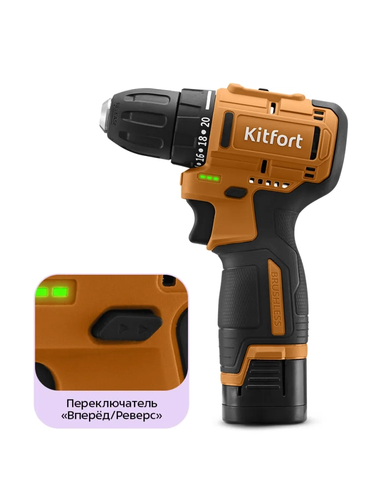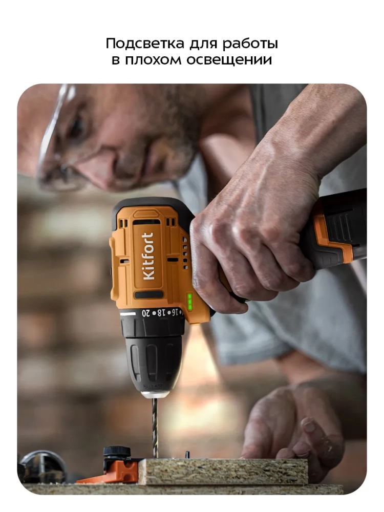 Аккумуляторная дрель-шуруповерт Kitfort КТ-6504 поможет вам провести ремонтные работы или собрать мебель. С ней вы легко и быстро сможете закрутить или выкрутить шурупы или винты, а также просверлить отверстия в разных поверхностях. Благодаря подсветке в верхней части устройства будет удобно работать даже в плохо освещенных местах. Подсветка загорается вместе с включением дрели-шуруповерта.
