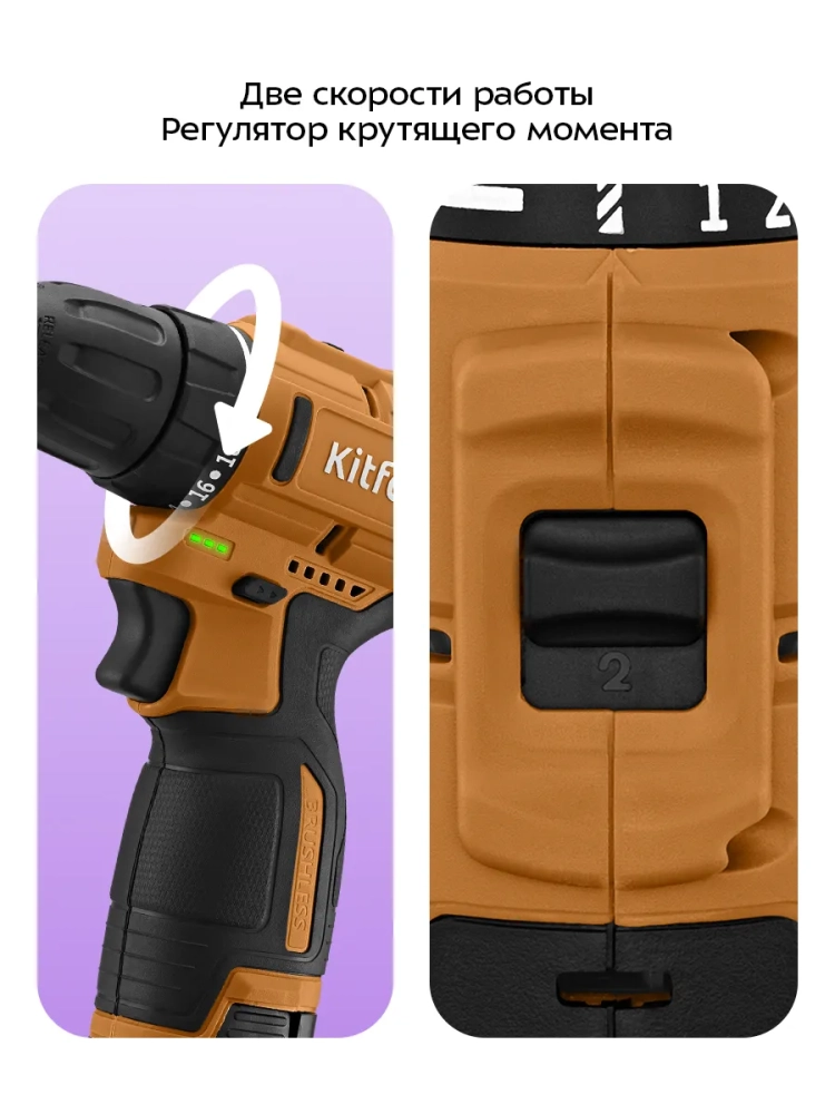 Дрель-шуруповерт КТ-6504 удобно лежит в руке. Устройство оснащено двумя скоростями работы и регулятором крутящего момента. Крутящий момент — это показатель, определяющий величину вращающего усилия. Чем он больше, тем в более твердые материалы можно вкрутить шуруп. Также на регуляторе крутящего момента отмечено положение, предназначенное для сверления отверстий.