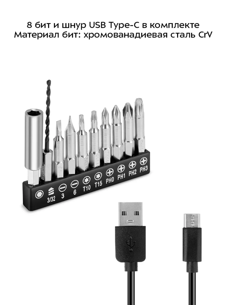 Устройство оснащено переключателем уровня крутящего момента. Крутящий момент — это показатель, определяющий величину вращающего усилия. Максимальный крутящий момент отвертки КТ-4063 подходит для бытовых нужд: сбора мебели или мелкого ремонта. Набор из 8 бит позволяет использовать отвертку для работы с шурупами и винтами с различными шлицами. Материал бит: хромованадиевая сталь CrV.