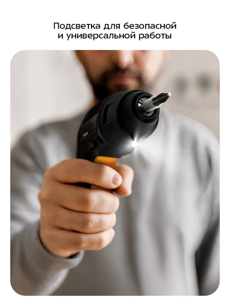 Отвертка, все биты, удлинитель для бит и блок питания удобно складываются в специальный кейс из комплекта.