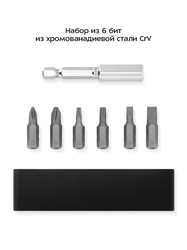 Одна из главных характеристик отвертки — крутящий момент. Крутящий момент — это показатель, определяющий величину вращающего усилия. Максимальный крутящий момент отвертки КТ-6508 подходит для бытовых нужд: сбора мебели или мелкого ремонта. Набор из 6 бит позволяет использовать отвертку для работы с шурупами и винтами с различными шлицами. Материал бит: хромованадиевая сталь CrV.