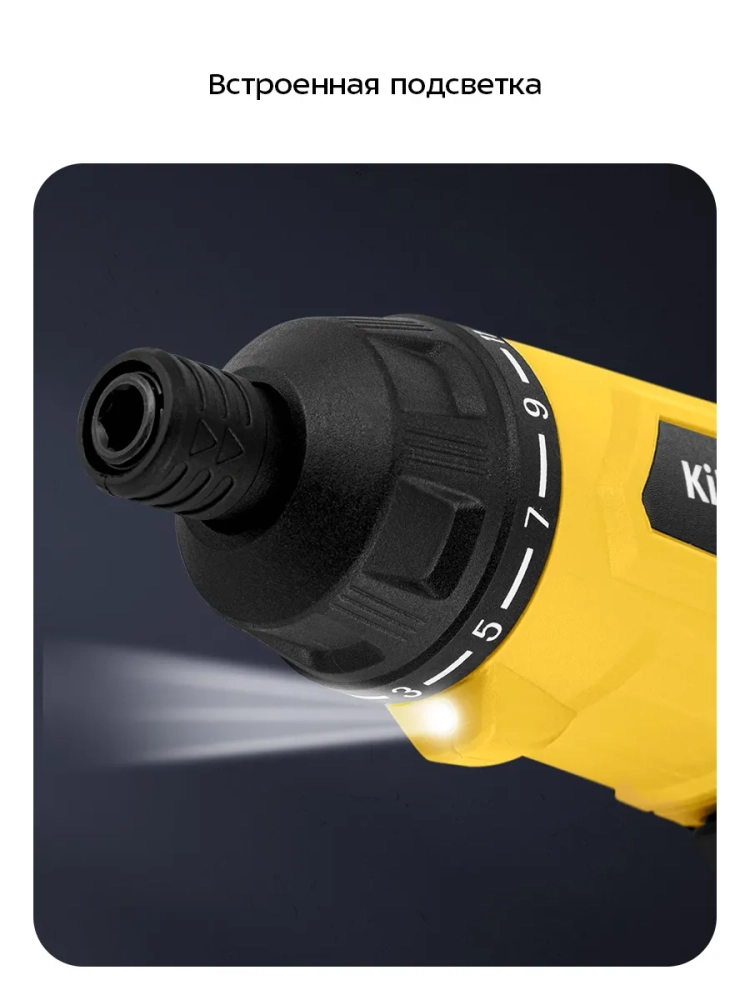 Отвертка КТ-6492 имеет Г-образную форму и удобно лежит в руке. При необходимости форму устройства можно легко изменить на прямую. Благодаря подсветке в верхней части устройства будет удобно работать даже в плохо освещенных местах. Подсветка загорается вместе с включением отвертки. Также в ручке отвертки есть фонарик, который можно включить независимо от включения устройства.