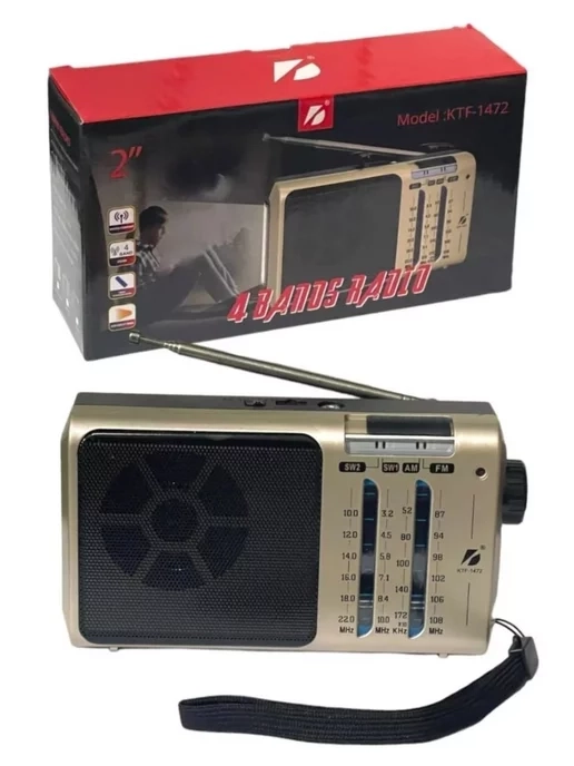 KTF-1472 — это перезаряжаемый портативный наружный радиоприемник. Он оснащен 2-дюймовым динамиком для воспроизведения радио AM, FM и SW в четырех полосах. Для удобства прослушивания предусмотрен разъем для наушников. Также в радиоприемник встроен светодиодный фонарик. Портативное трёхдиапазоное радио, охватывающее в том числе и FM диапазон. Радиоприемник работает в диапазонах FM, AM, SW. Работает от сети и батареек, можно включить в сеть 220В и оставить его возле розетки, а можно взять с собой - он будет работать как от собственного встроенного аккумулятора, так и от сменных батареек (в комплект не входят). Поймать радиоволну помогает выдвигающаяся антенна. Вы можете прослушивать радио в любом месте на даче, в походе. Радиоприемник ретро от батареек. Портативный радиоприемник, радио, FM-диапазон и воспроизведение с носителей.
