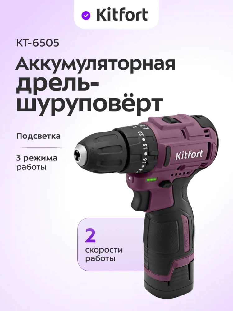 Аккумуляторная ударная дрель-шуруповерт КТ-6505 — это надежный электроинструмент, который станет незаменимым помощником в вашем арсенале. Этот мощный инструмент идеально подходит для выполнения различных ремонтных работ и сборки мебели. Благодаря аккумуляторному питанию, вы сможете использовать его в любом месте без необходимости подключения к сети. Дрель-шуруповерт оснащена ударным режимом работы, что позволяет эффективно справляться с откручиванием прикипевшего крепежа и сверлением небольших отверстий в твердых материалах, таких как бетон. Удобство использования обеспечивается наличием подсветки, которая активируется вместе с включением устройства и позволяет работать даже в условиях недостаточного освещения. Эта модель имеет две скорости работы и регулятор крутящего момента до 40 Н*м, что дает возможность вкручивать шурупы даже в самые твердые материалы. Патрон дрели позволяет устанавливать различные биты и сверла диаметром до 10 мм (не входят в комплект). Максимальное число оборотов холостого хода достигает 1500 об/мин на высокой скорости. Аккумулятор Li-Ion емкостью 2 А*ч обеспечивает длительное время непрерывной работы до 45 минут после полной зарядки за 1,5 часа. Компактные размеры устройства (159 × 59 × 203 мм) делают его удобным для хранения и транспортировки. Уровень шума не превышает ≤83 дБ, что делает работу комфортной даже при длительном использовании.