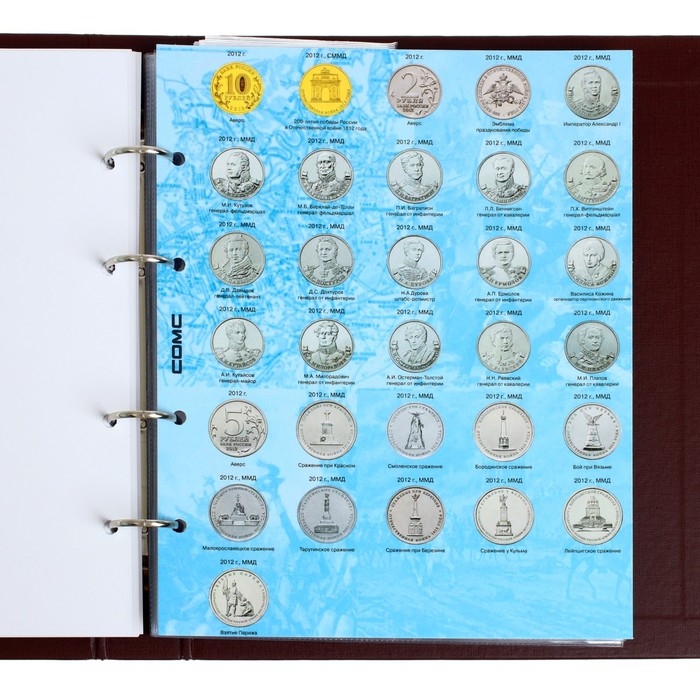 В альбом входит - 6 разделителей с изображением 10 рублёвых юбилейных монет России (5 листов на 24 ячейки) и 1 разделитель с изображением 2-х рублевые и 5-ти рублевые монеты 2012 г., посвященные 200-летию победы в Отечественной войне 1812 г. (1 лист на 35 ячеек).