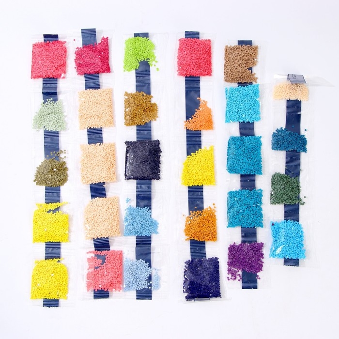 Разложите кристаллики с помощью карандаша по указанной схеме, заполнив всё полотно. На картине уже обозначены необходимые оттенки. Холст с клеевым покрытием будет надёжно удерживать стразы.