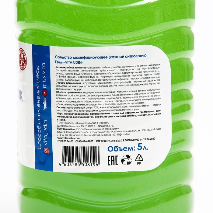 Антисептик VITA UDIN, для рук, гель, 5 л