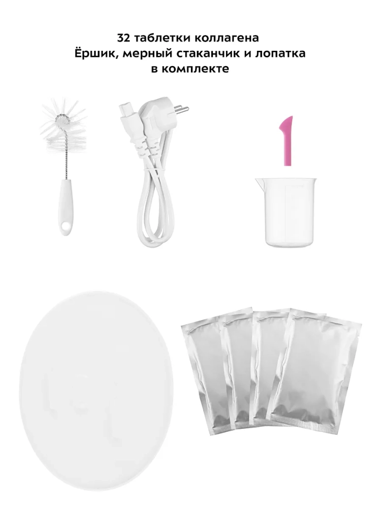 В комплекте к прибору идут 32 таблетки коллагена, которые впоследствии можно докупить. Маску очень легко готовить: с помощью мерного стаканчика налейте в резервуар прибора 60 мл воды или молока, 20 мл фруктового (овощного) сока, добавьте 1 таблетку коллагена. Через 5 минут маска будет готова, ее необходимо вылить в специальную форму и дать остыть. Готовая маска идеально принимает форму лица, не доставляет дискомфорт и не оставляет после себя липкого слоя.